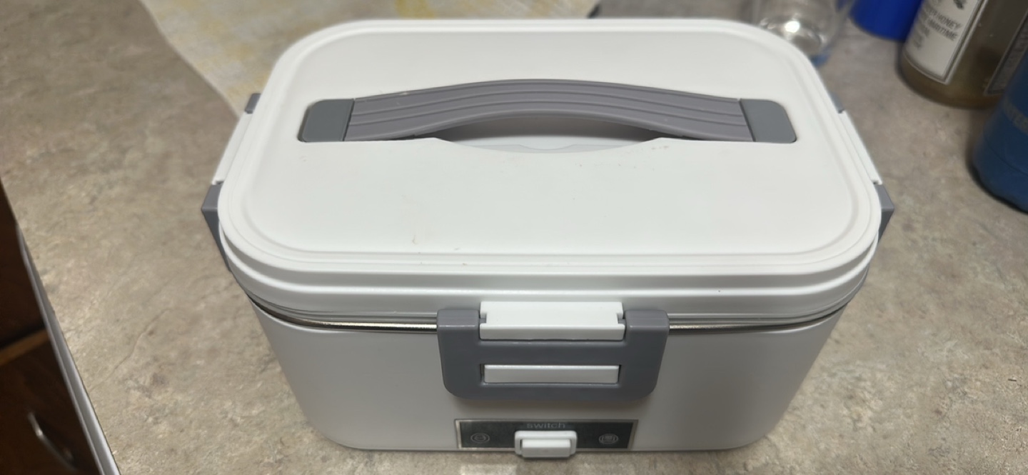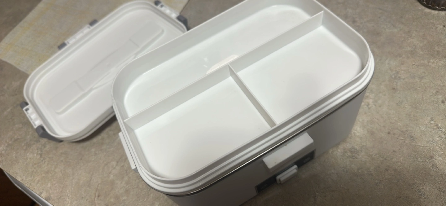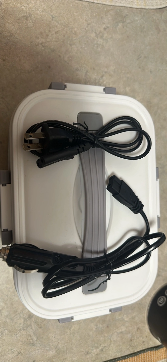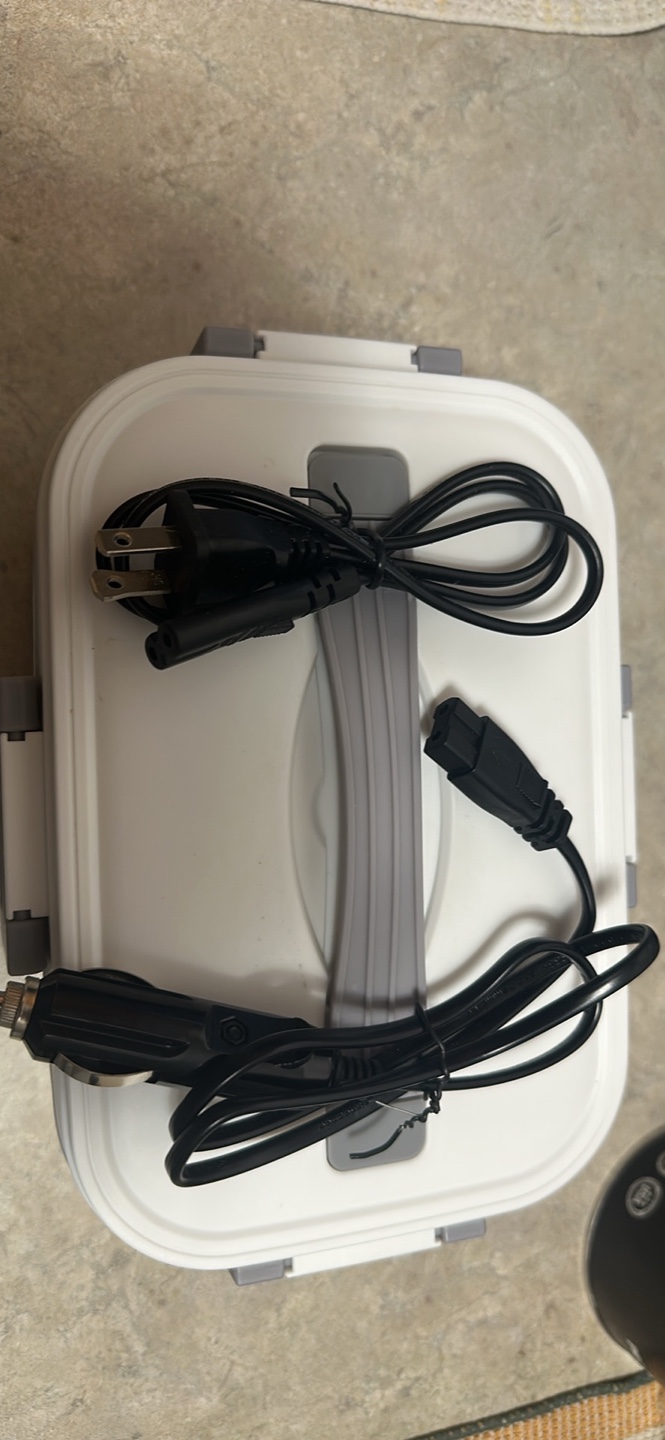 Portable electric lunch box. Heats food. Includes power cords for both wall outlet and car. Three compartments. Stainless steel interior. Great for work or travel.