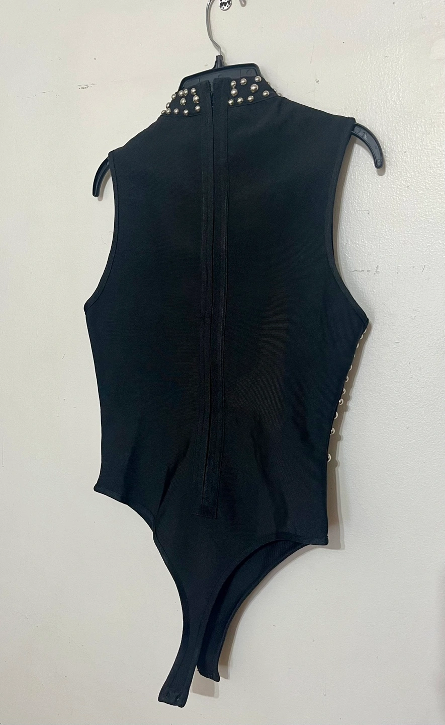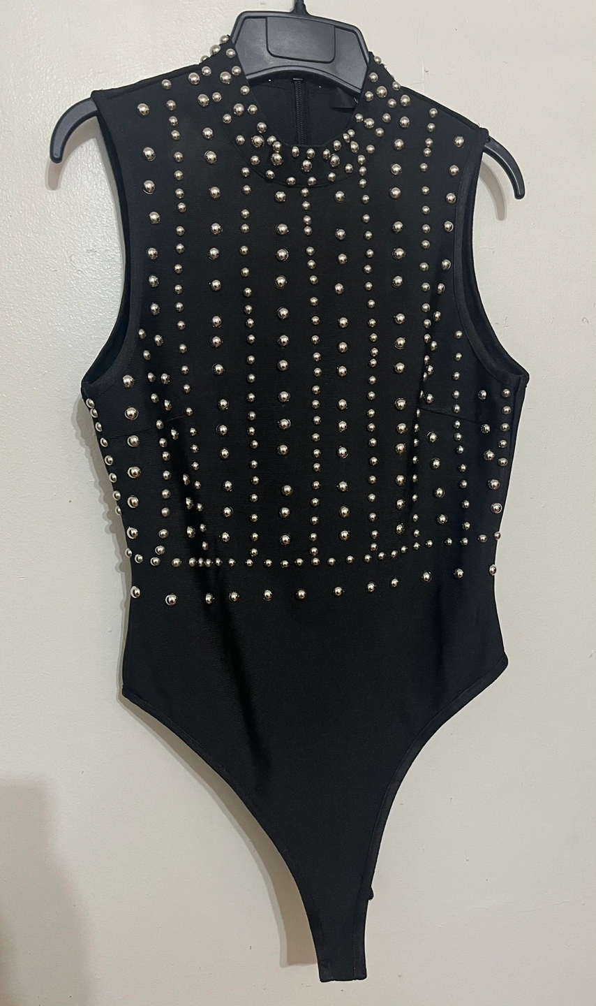 Black bodysuit, sleeveless, mock neck. Silver studs adorn the front. Snap closure. It is a size 6, but very fitted.