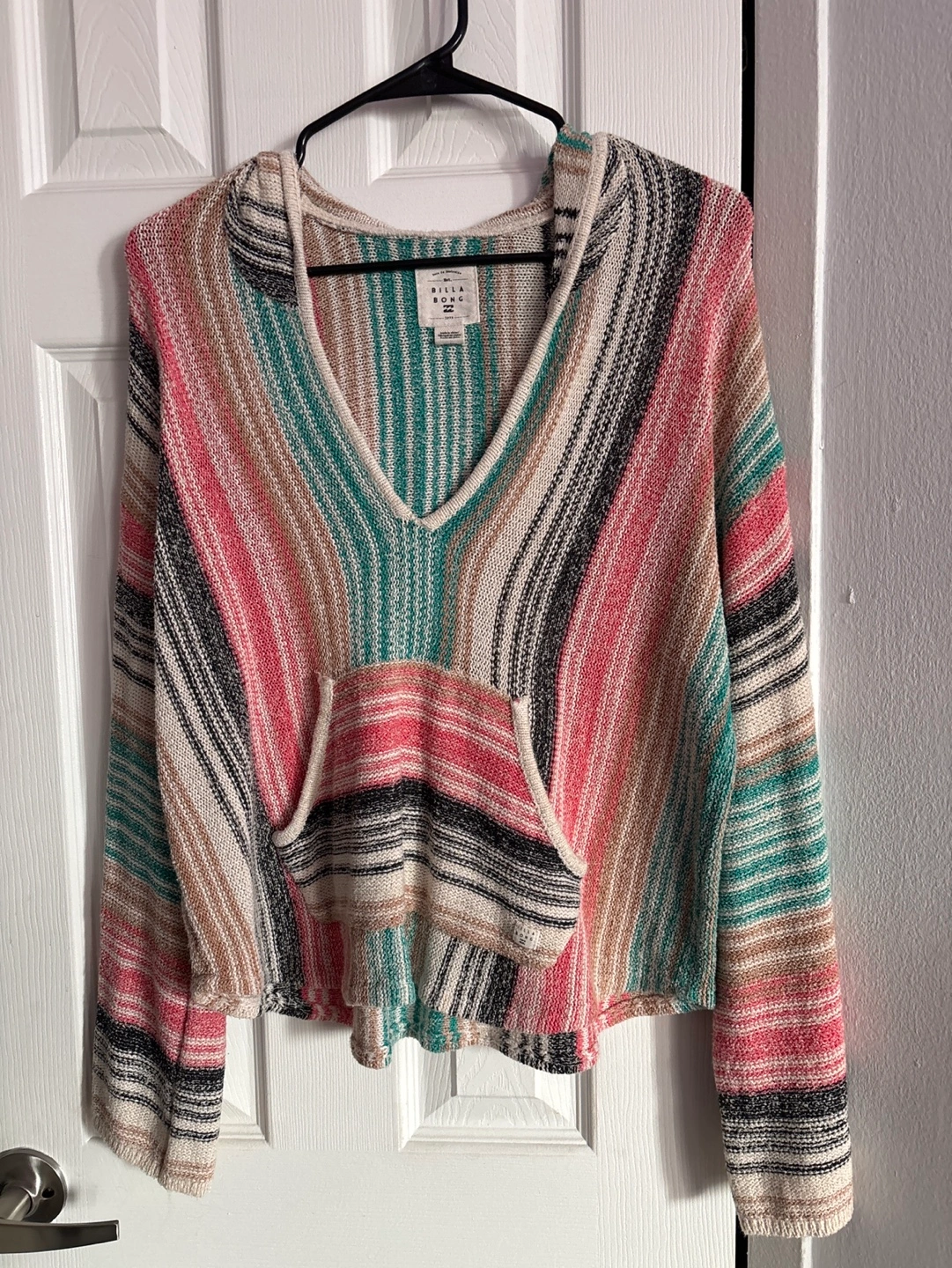 Billabong hooded poncho sweater. Multicoloured stripes. Relaxed fit. Front kangaroo pocket. Super cute boho vibe