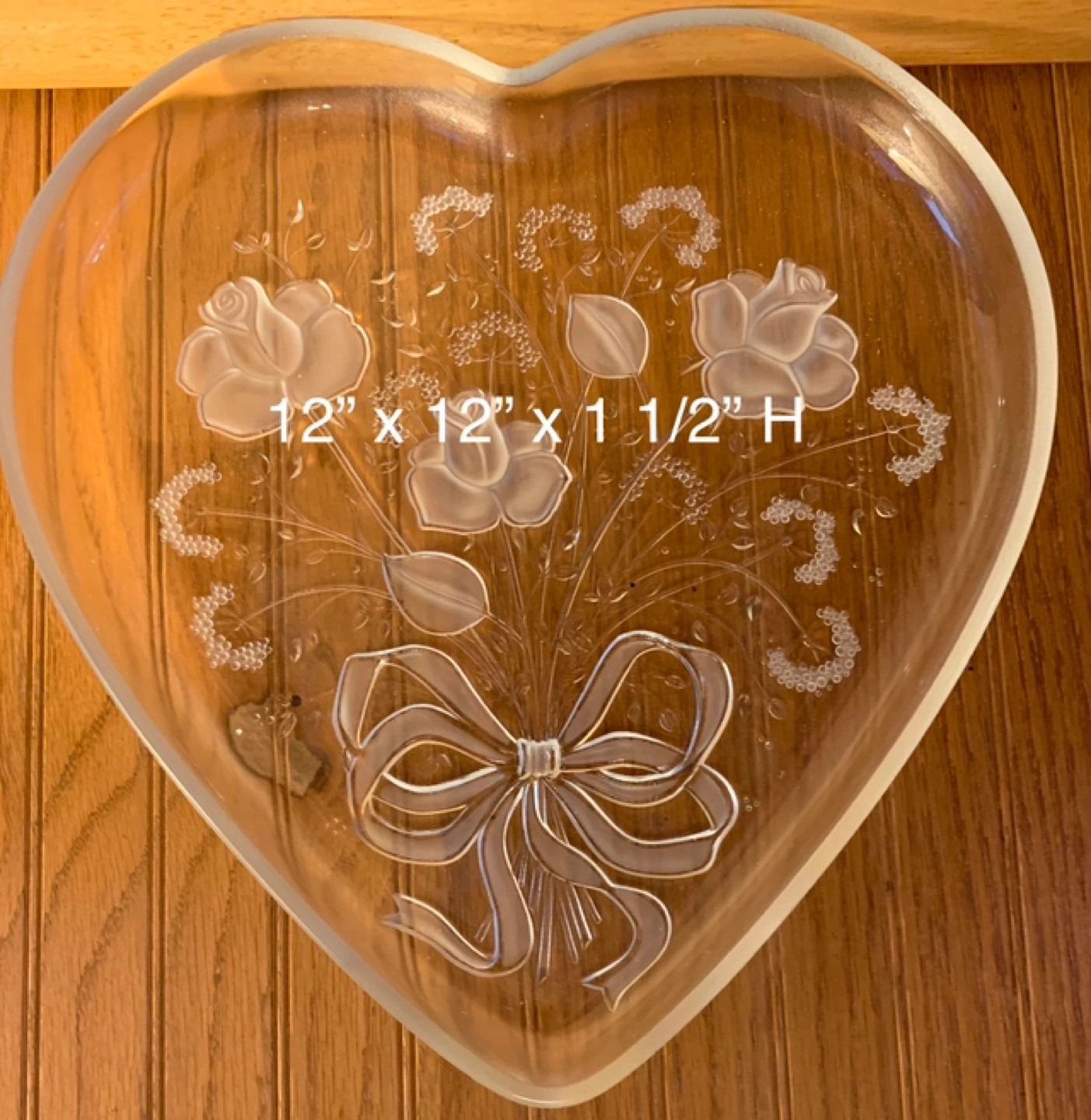 Lovely heart-shaped glass serving tray. Features an etched design of roses and a bow. Measures 12" x 12" x 1 1/2" H. Perfect for serving or display.
