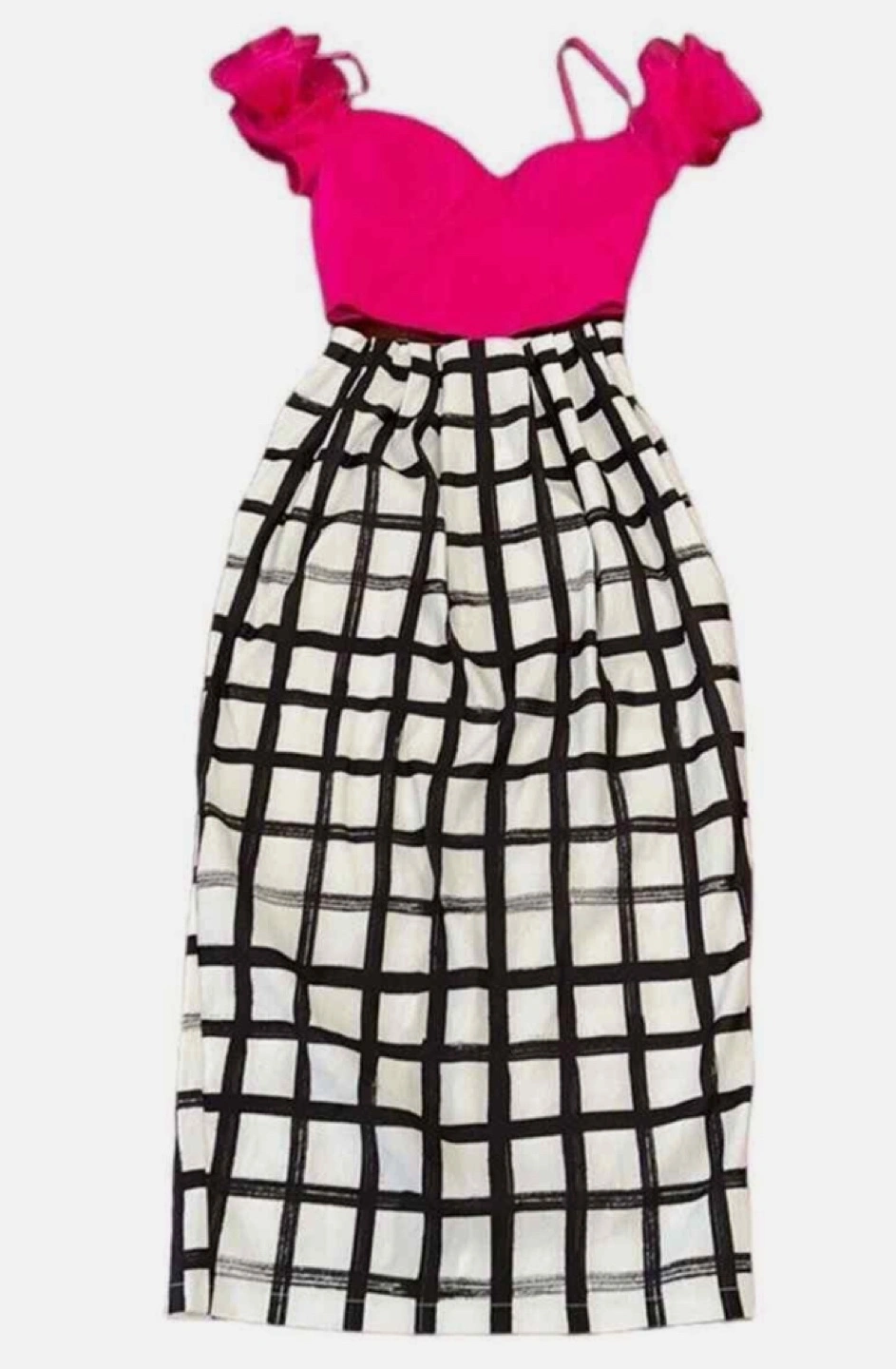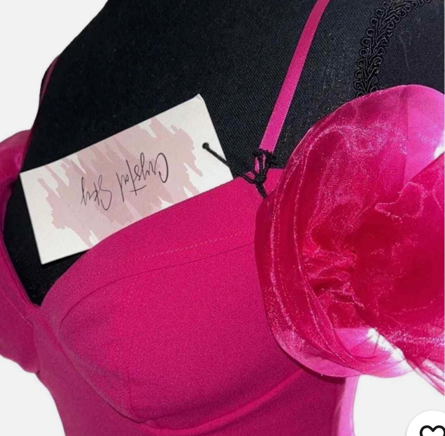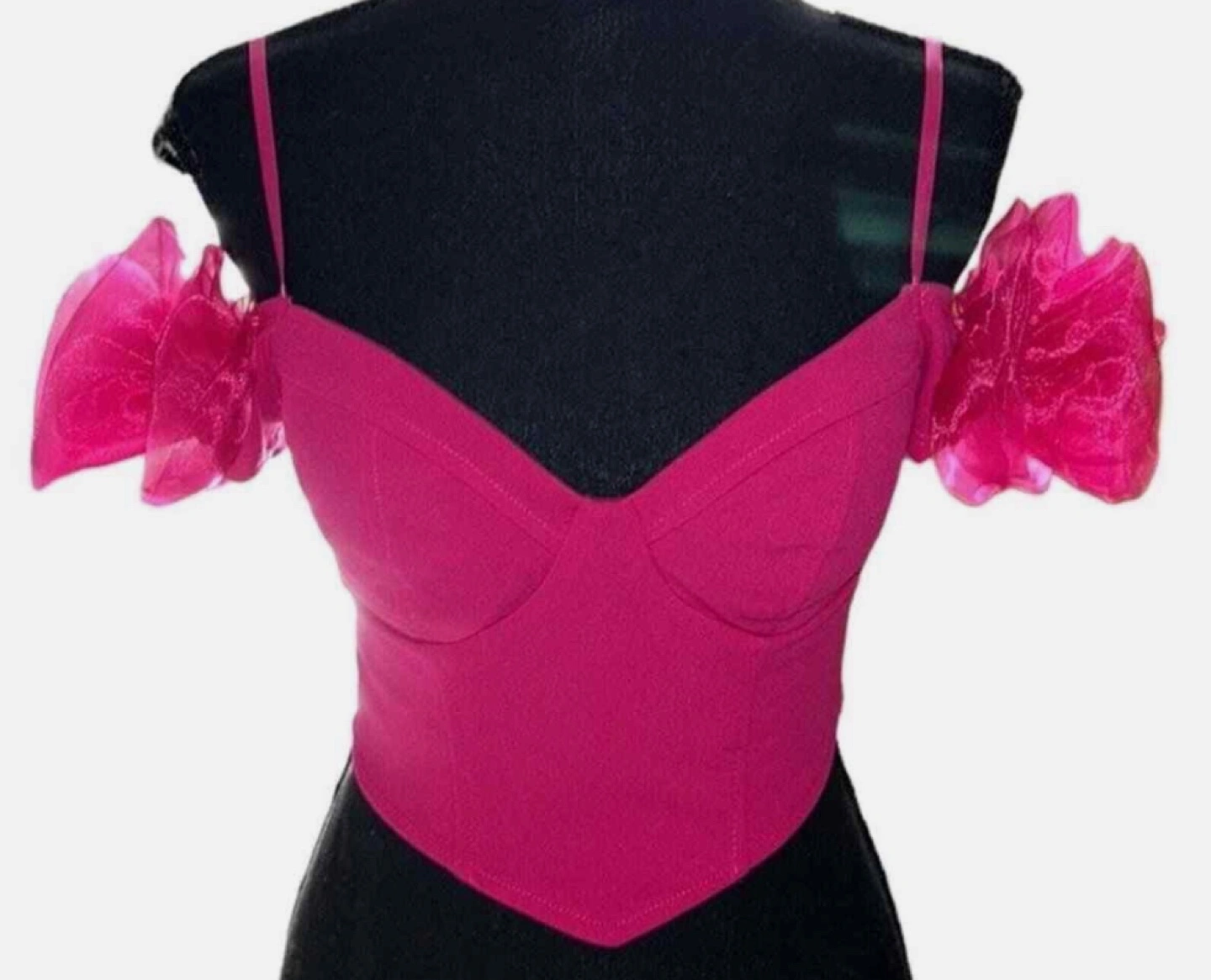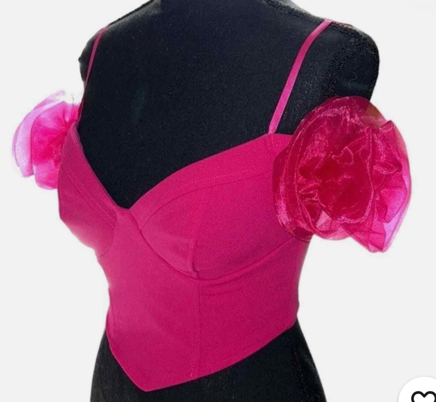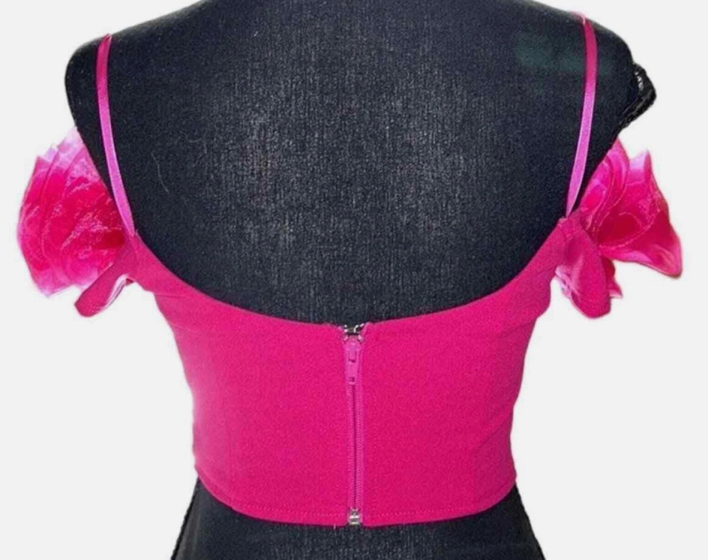 Stunning hot pink crop top. Features off-the-shoulder design. Organza rosettes on shoulders. Back zipper closure. Perfect for a night out.