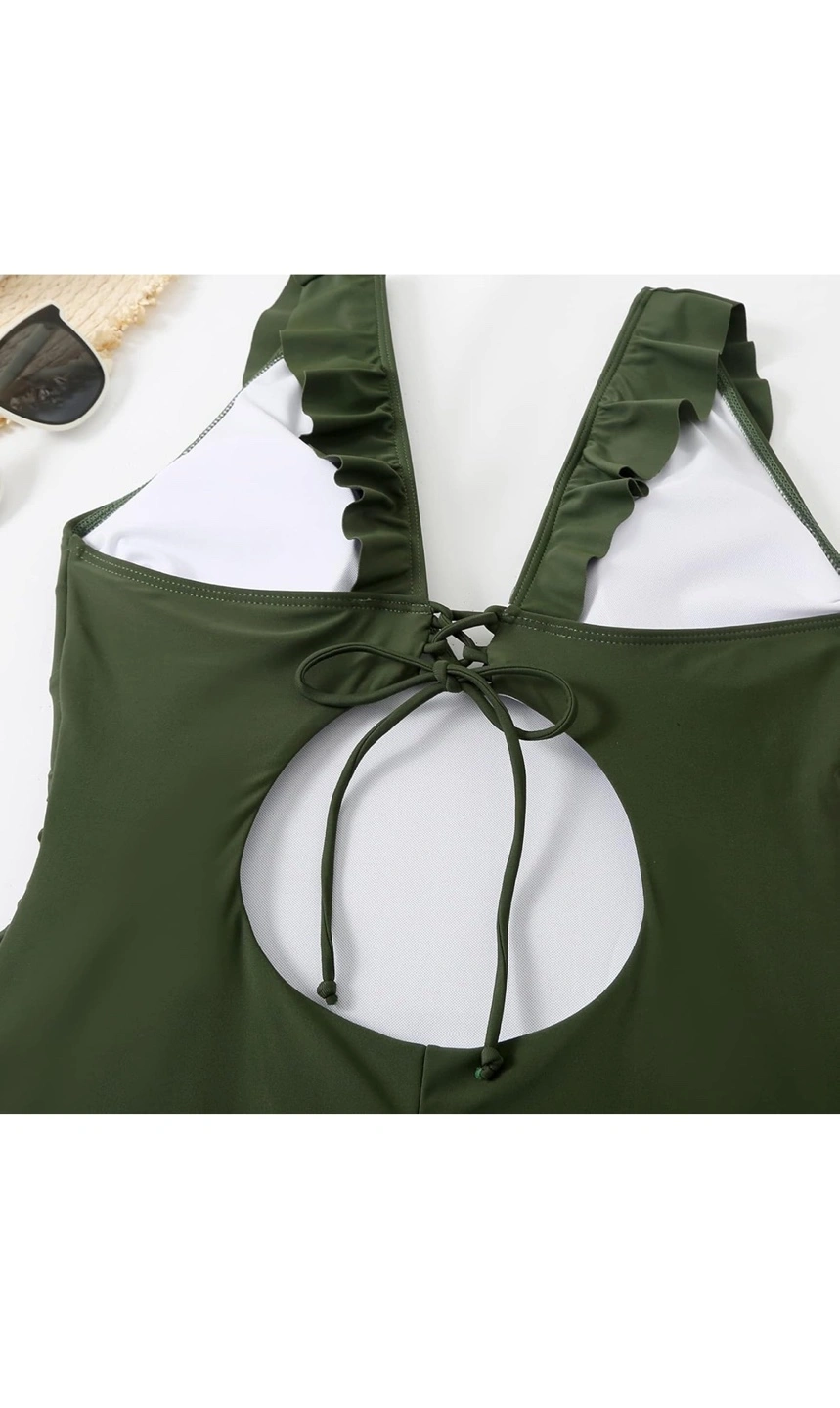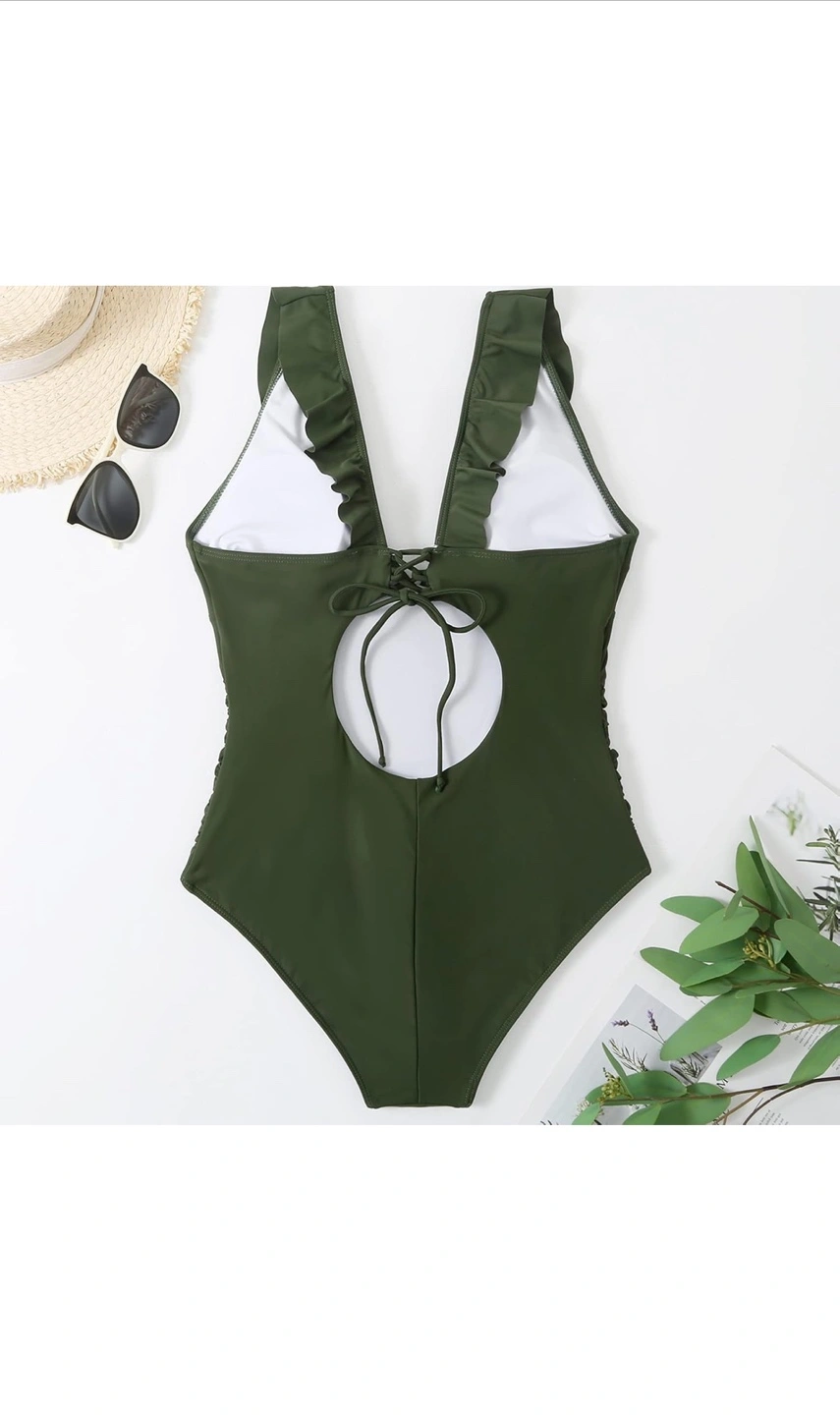 Stunning olive green one-piece swimsuit. Features ruffles and a flattering V-neckline. Open back with lace-up detail. Ruched sides for a slimming effect. Perfect for summer.