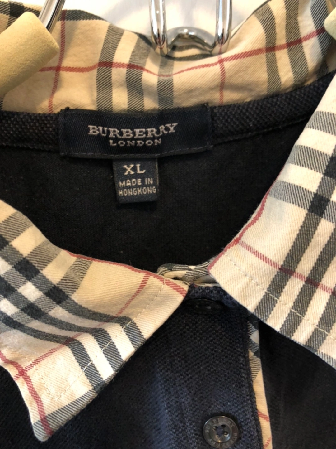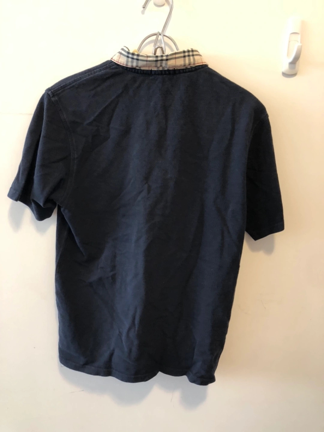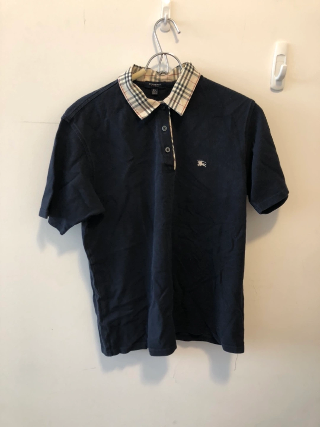 Burberry Navy blue polo shirt. Features a unique plaid collar. Made in Hong Kong. Size XL.