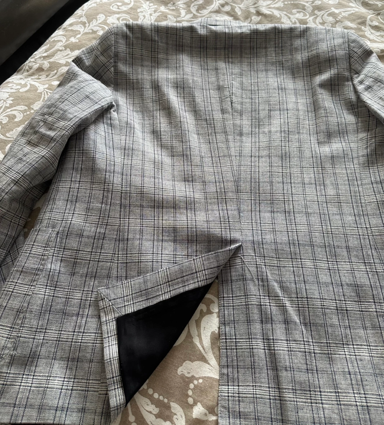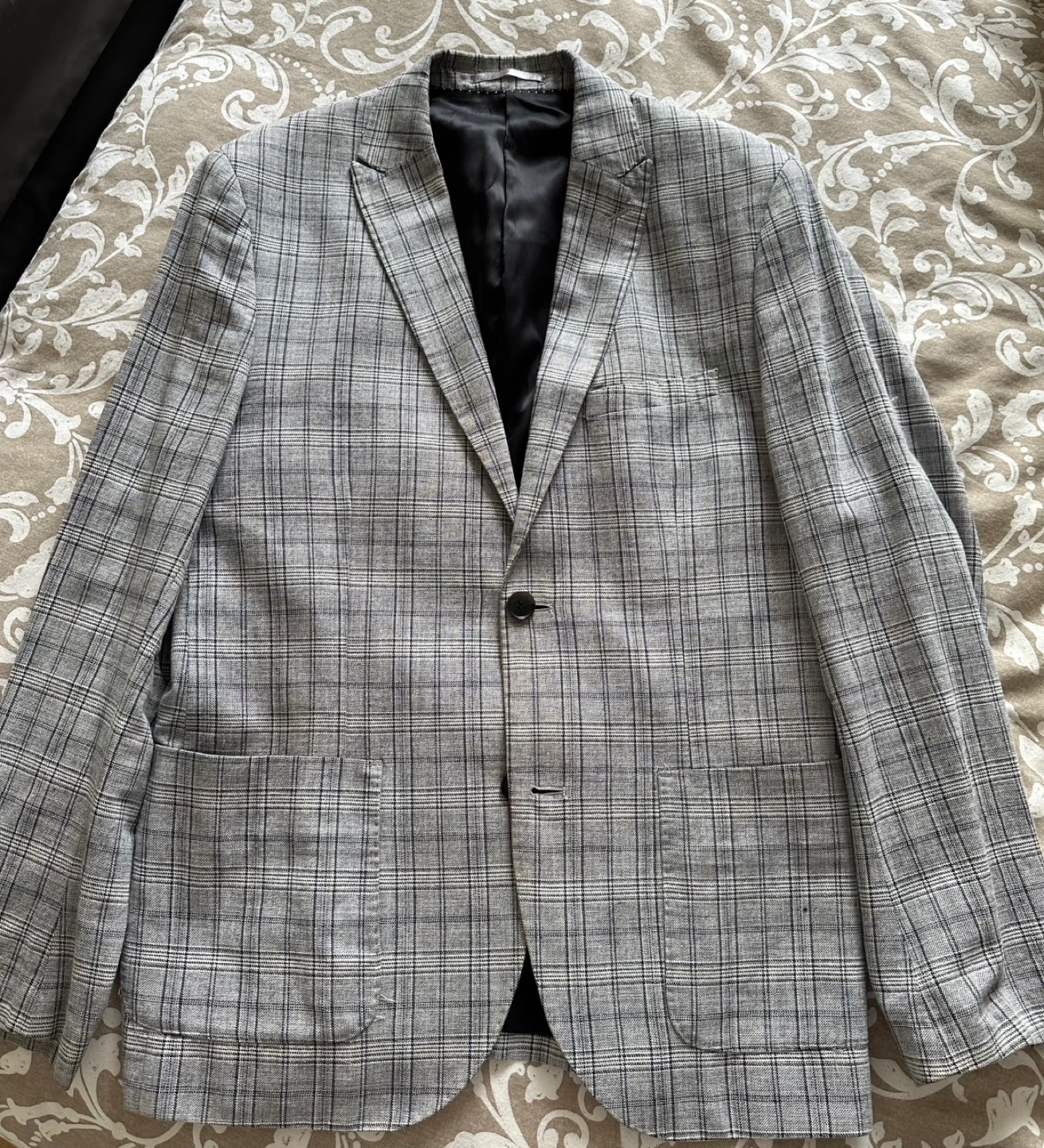 Grey H&M men’s checked blazer. Regular fit. Two button closure. Patch pockets. Fully lined. Like new. No tear or issues. Fits a person who weighs 70-80kg and is around 1.70cm tall. Pick up near Scarborough Town Centre.