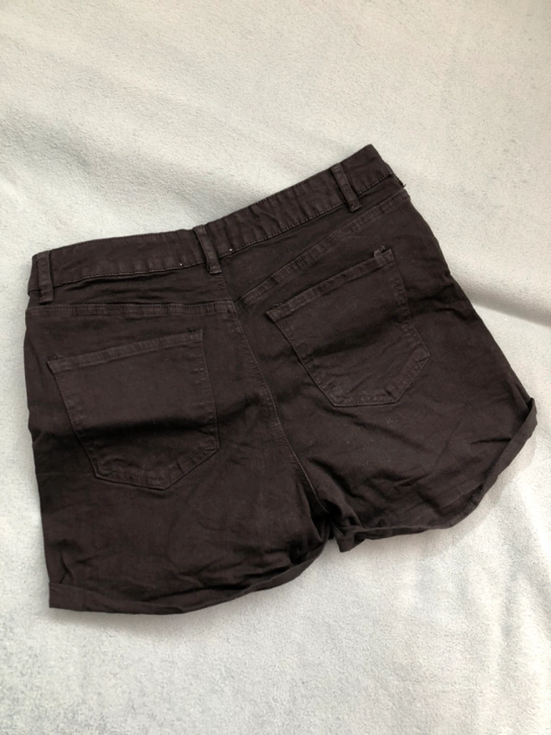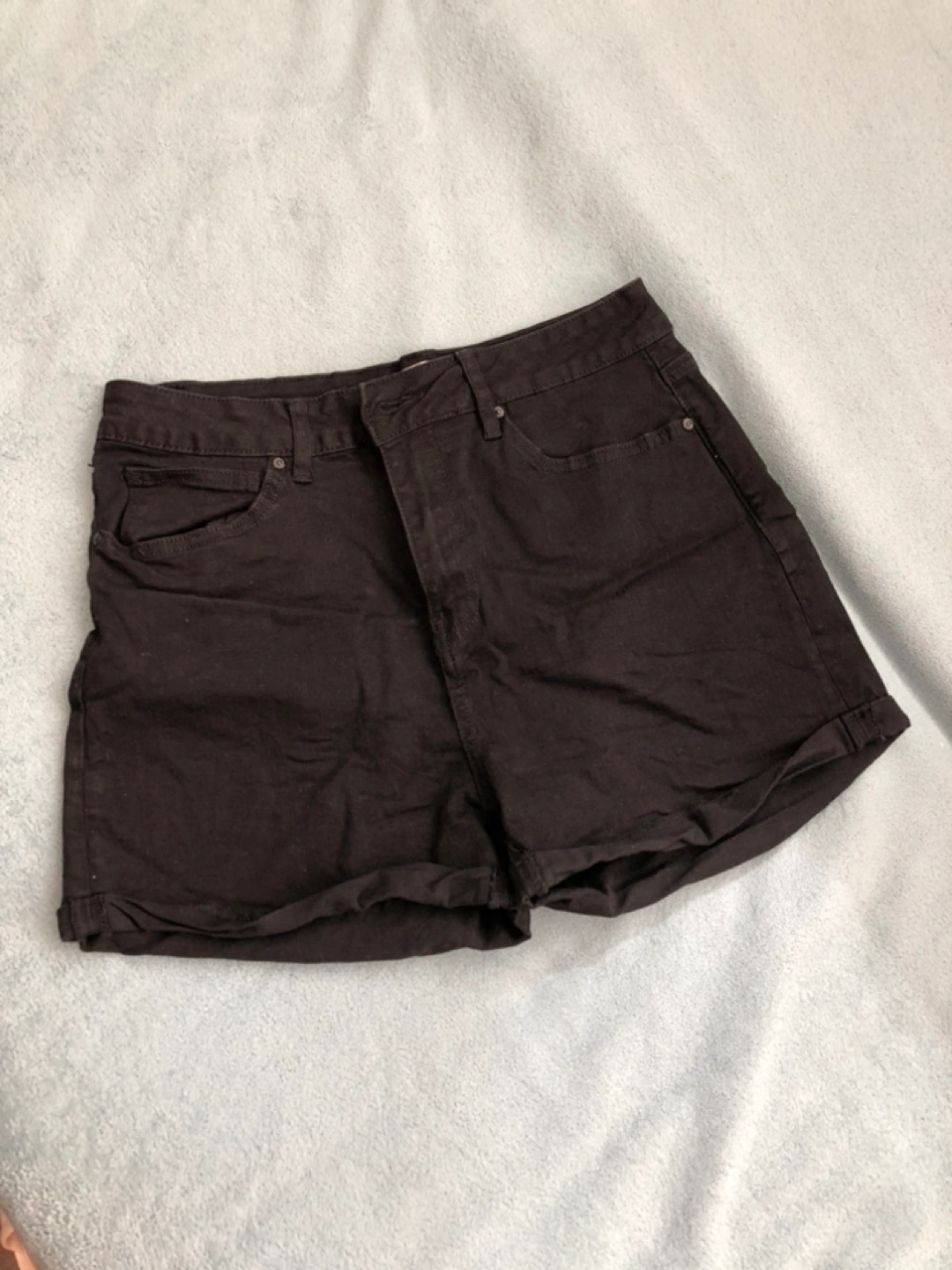 Black denim shorts. Size 7. Rolled cuffs. High-waisted. Classic style. Made in China.