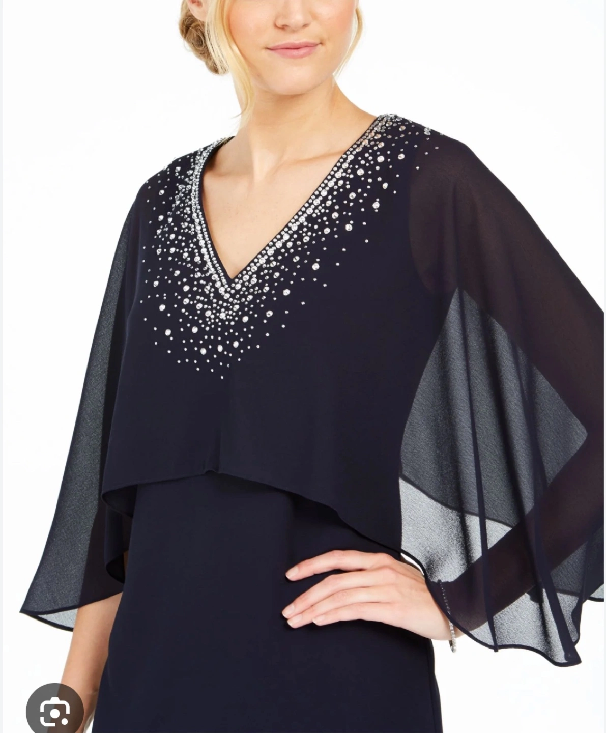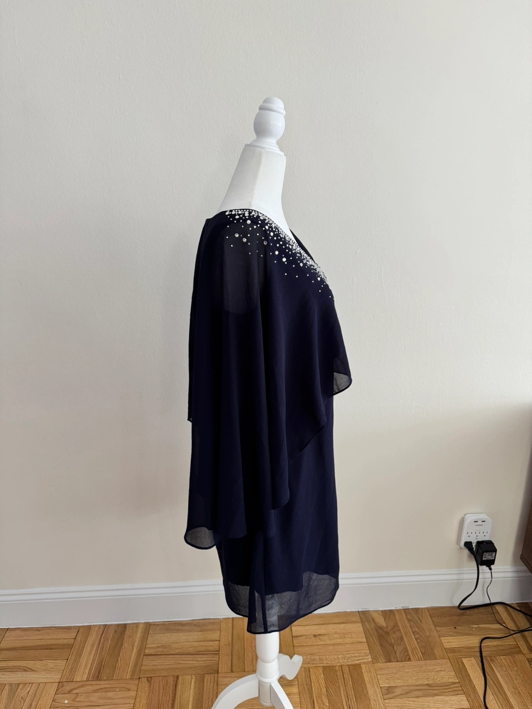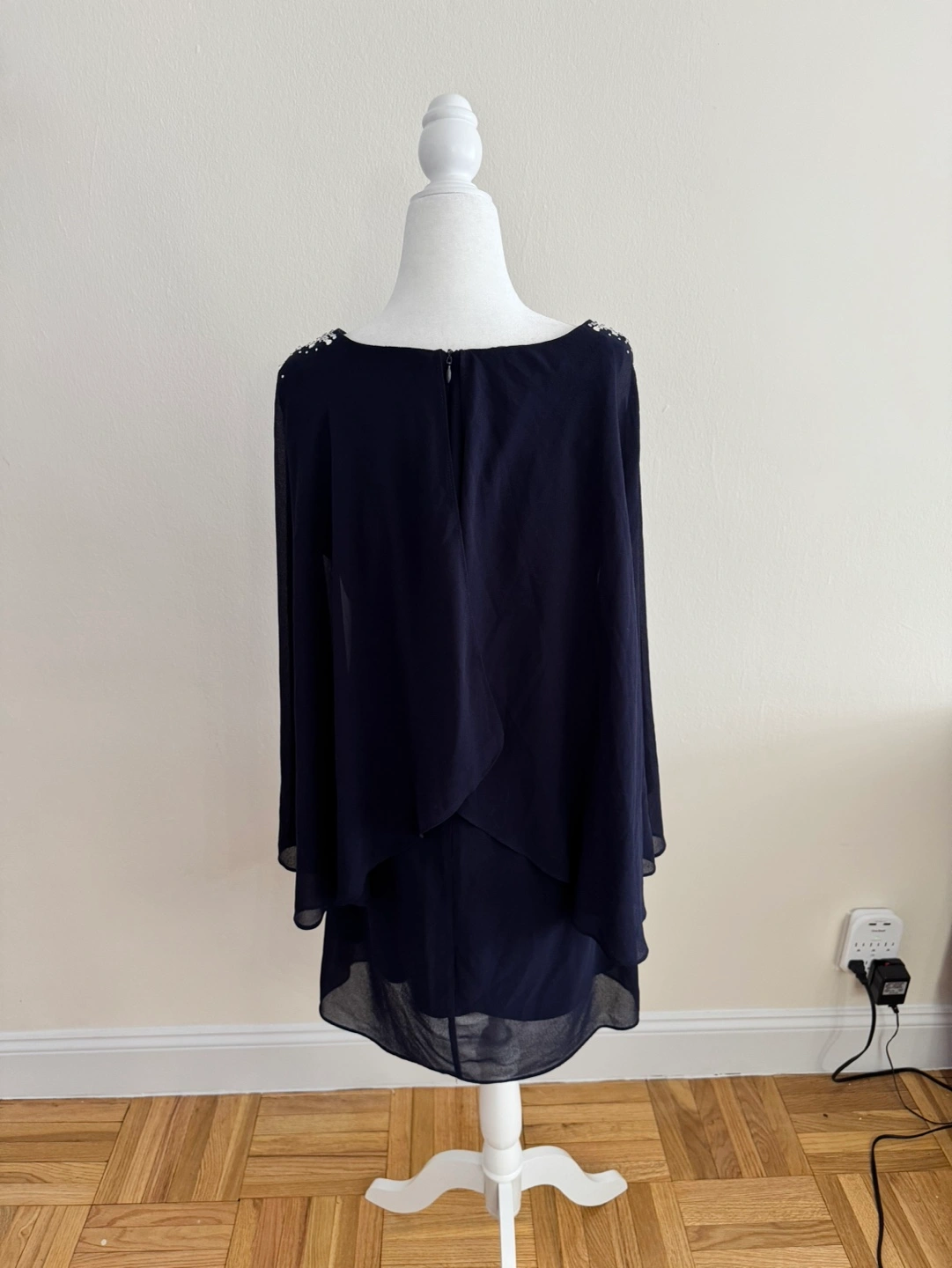 Stunning navy blue dress. Features a V-neck with beautiful beading. Chiffon overlay with 3/4 sleeves. Perfect for special occasions.