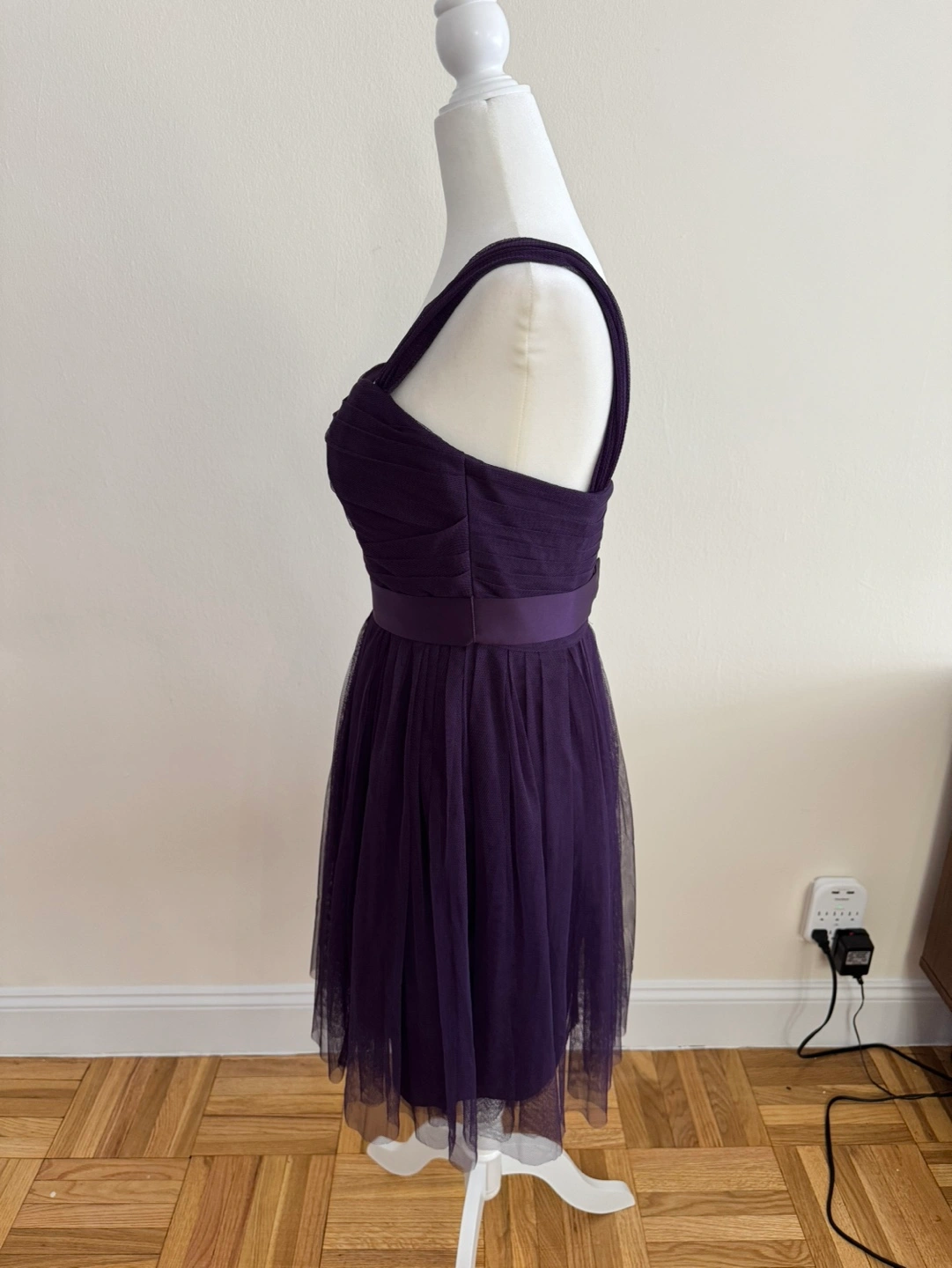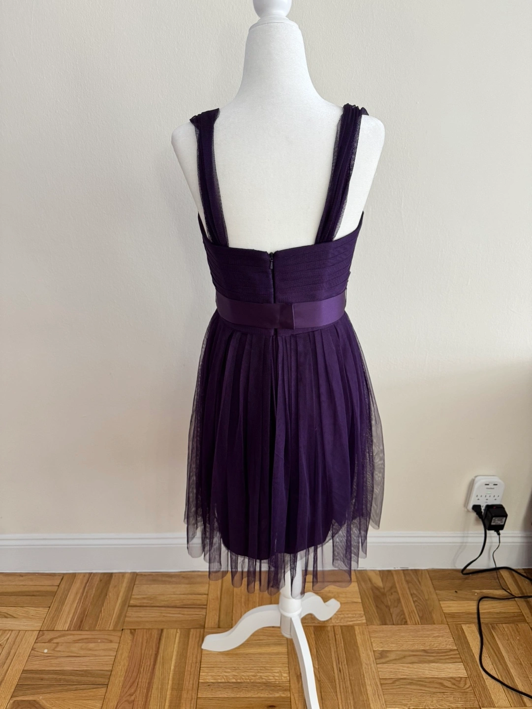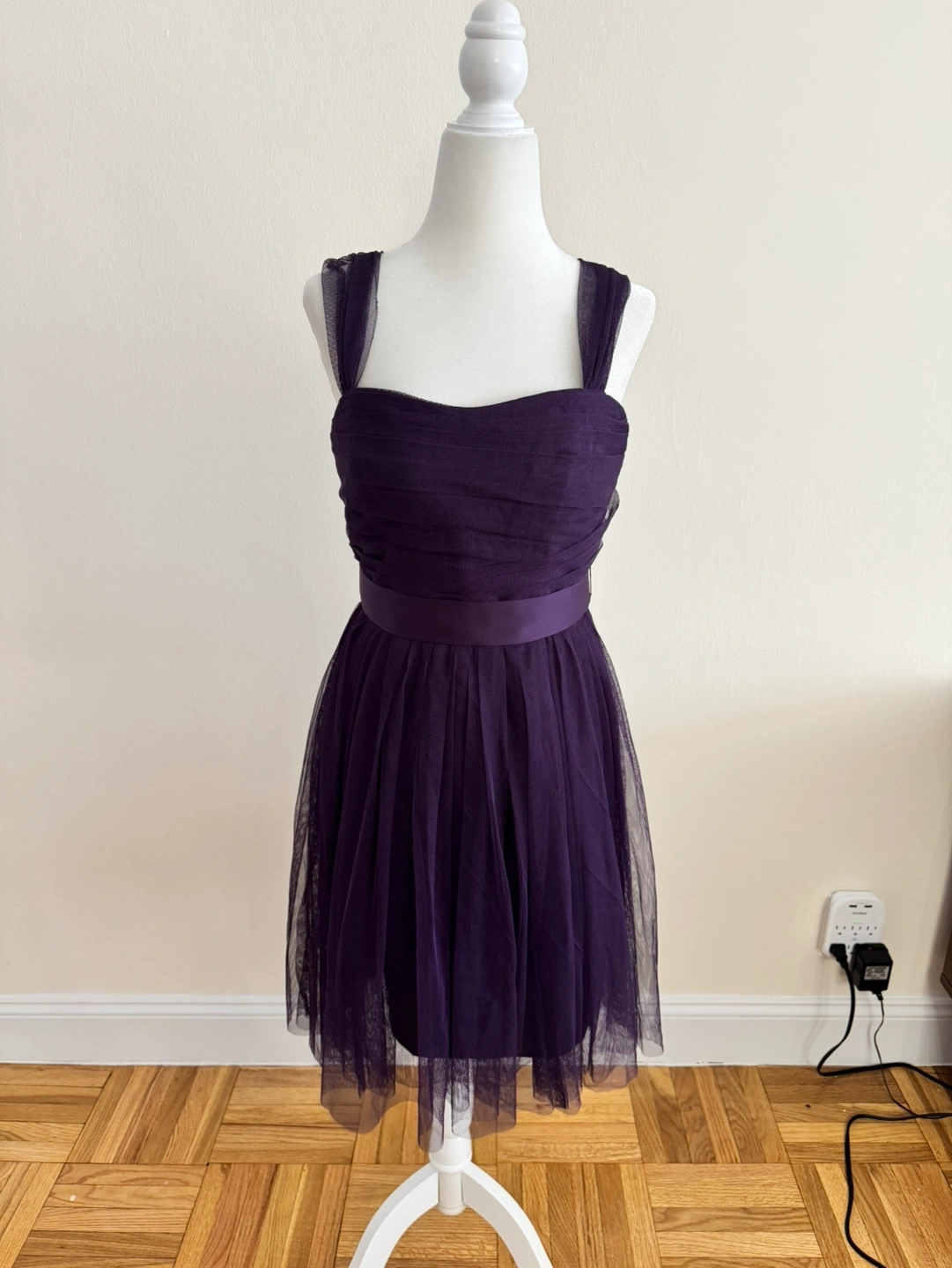 Beautiful purple tulle dress. Size 2. Features a pleated bodice and satin sash. A-line skirt. Sleeveless. Pickup is on 72nd and 1st in Manhattan. Preference given to whoever schedules pickup first.