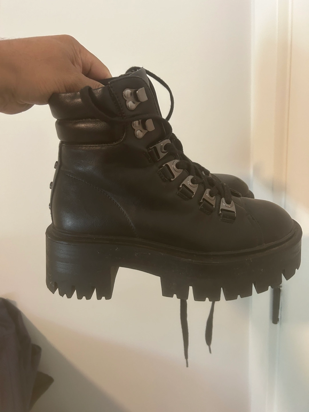 Women's black leather platform boots. Lace-up closure. Chunky platform sole. Metal accents. Excellent for fall and winter.