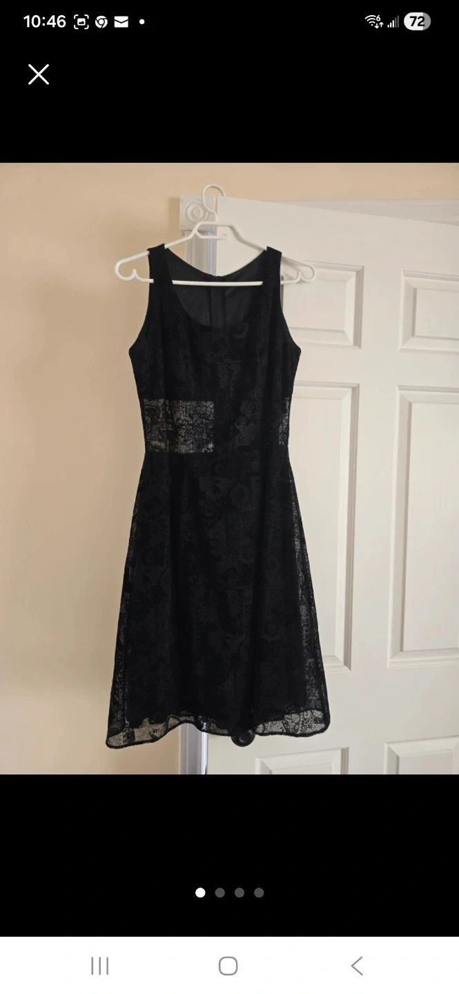 Elegant black dress. Features a lace overlay and sheer panel. Sleeveless, A-line silhouette. Great for special occasions. 🖤👗✨ #dress #lace #panel #silhouette #prom