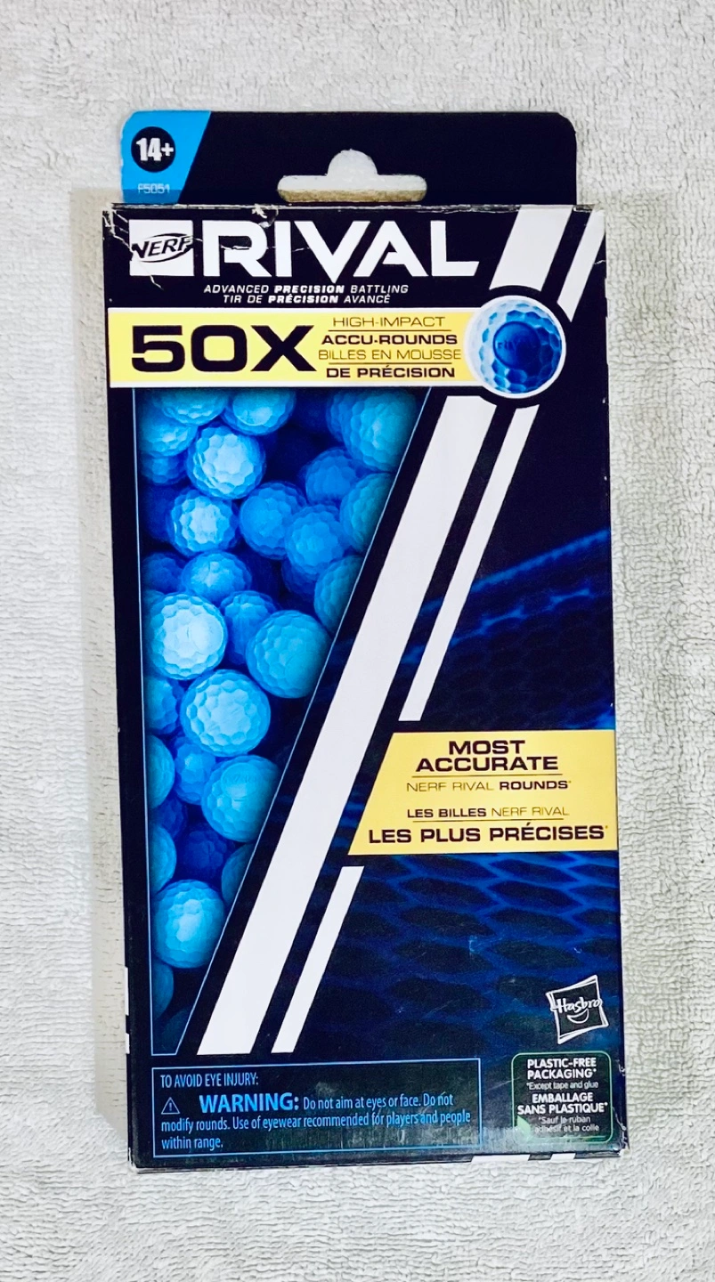 50x Nerf Rival Accu-Rounds. 50 blue high-impact Accu-Rounds. Nerf Rival rounds for advanced precision battling. Suitable for ages 14+. Most accurate Nerf Rival rounds. Compatible with all nerf rival blasters. Opened once. Never used.