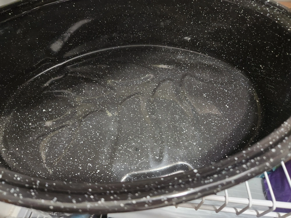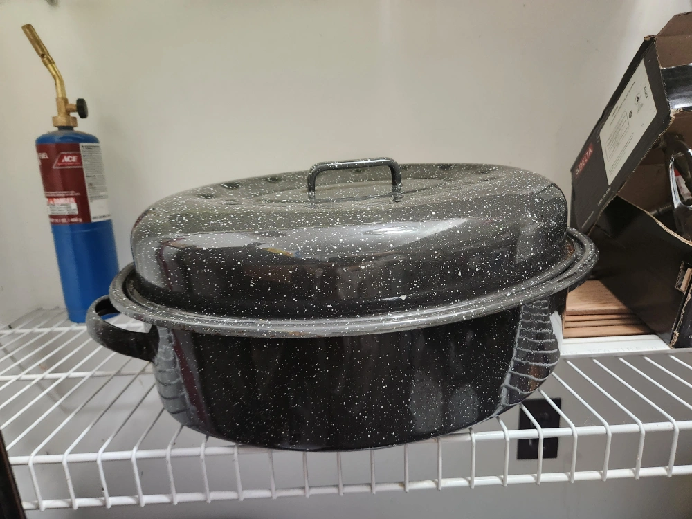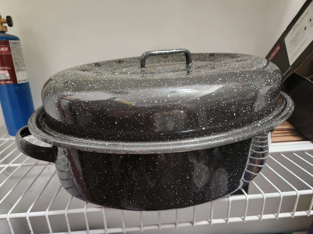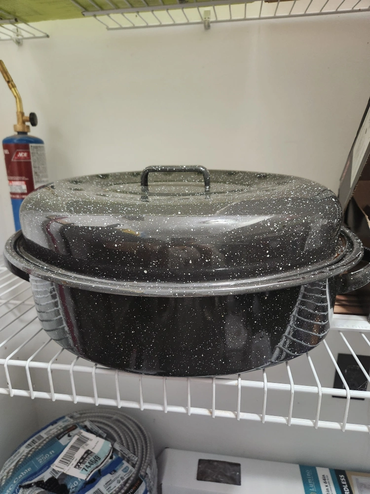 New Large black enamel roaster. Features two handles and a lid. Great for cooking large meals. I don't use it so giving it away!