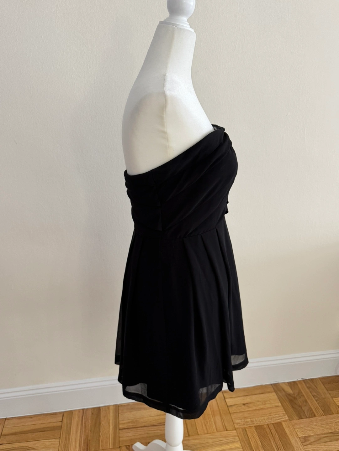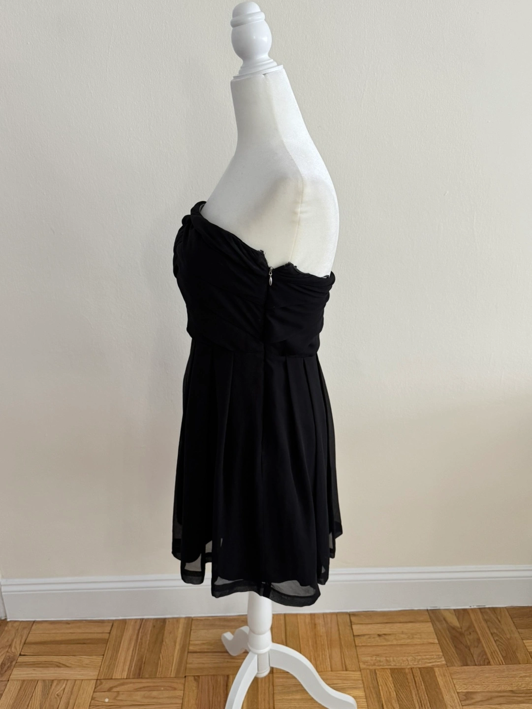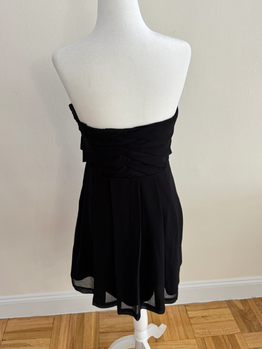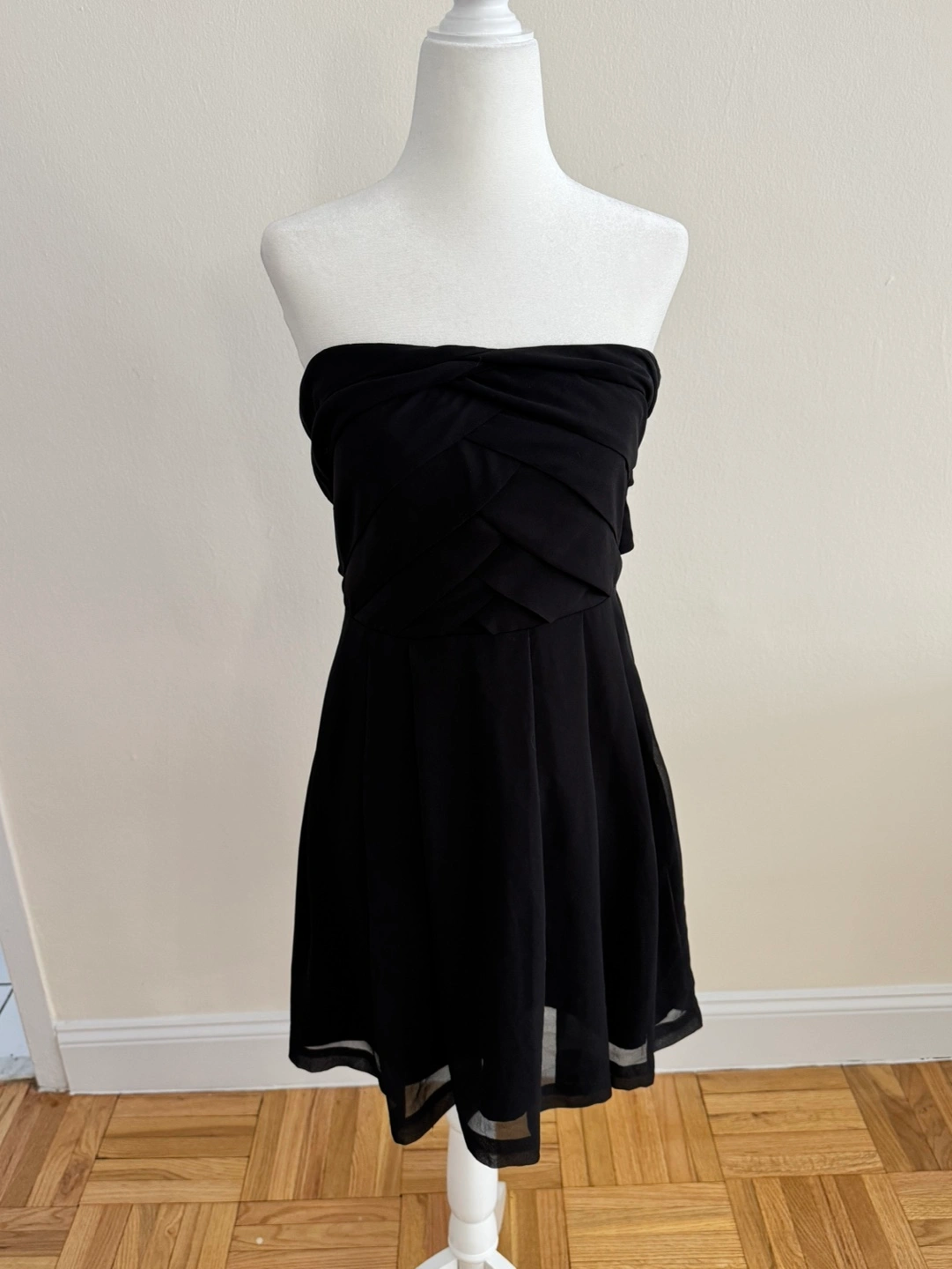 Adorable black mini dress. Strapless, A-line silhouette. Features pleated bodice. Back zipper closure. Perfect for a night out. Pickup is on 72nd and 1st in Manhattan. Preference given to whoever schedules pickup first.