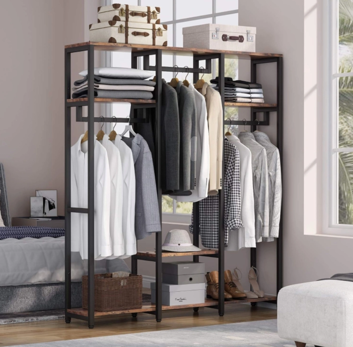 Freestanding Closet Organizer, Heavy Duty Garment Rack with Shelves and Hanging Rod, Open Wardrobe Closet for Hanging Clothes (Rustic)