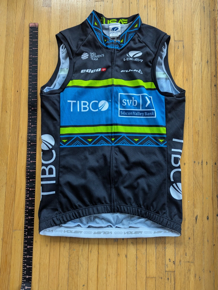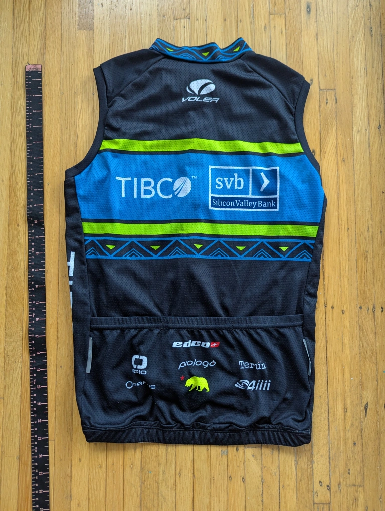 Voler cycling vest. Size small. Black, blue, and neon green. Multiple sponsor logos. 3 back pockets.