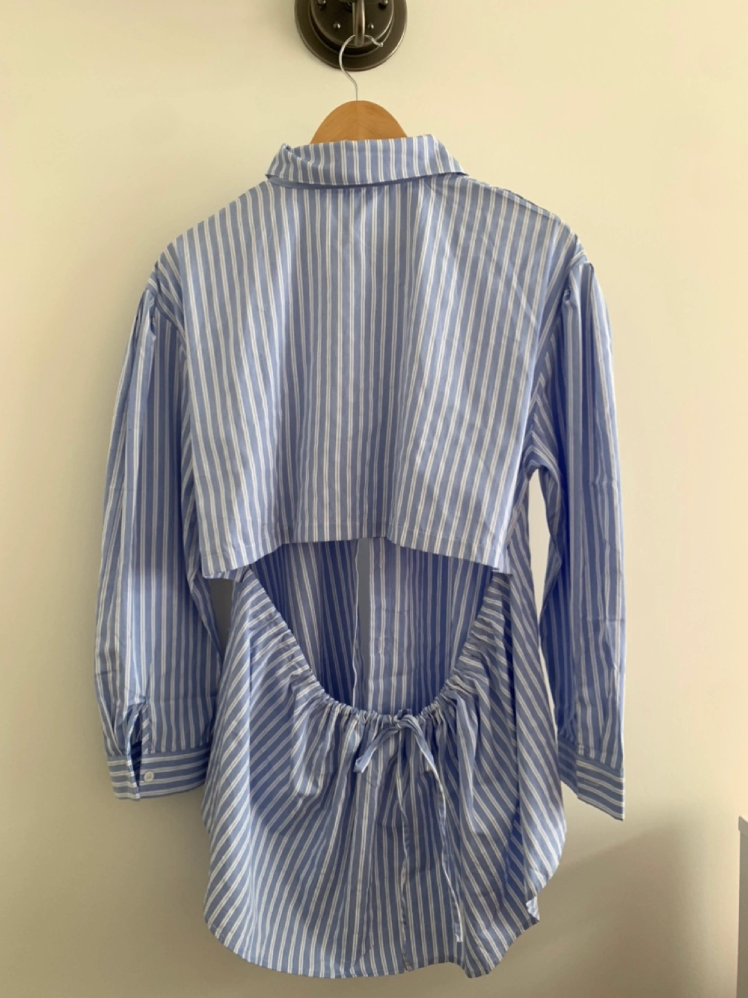 Women's long-sleeve button-up shirt. Blue and white stripes. Open back with tie detail. Size XL (but fits like a traditional medium in Canada). Made in China.