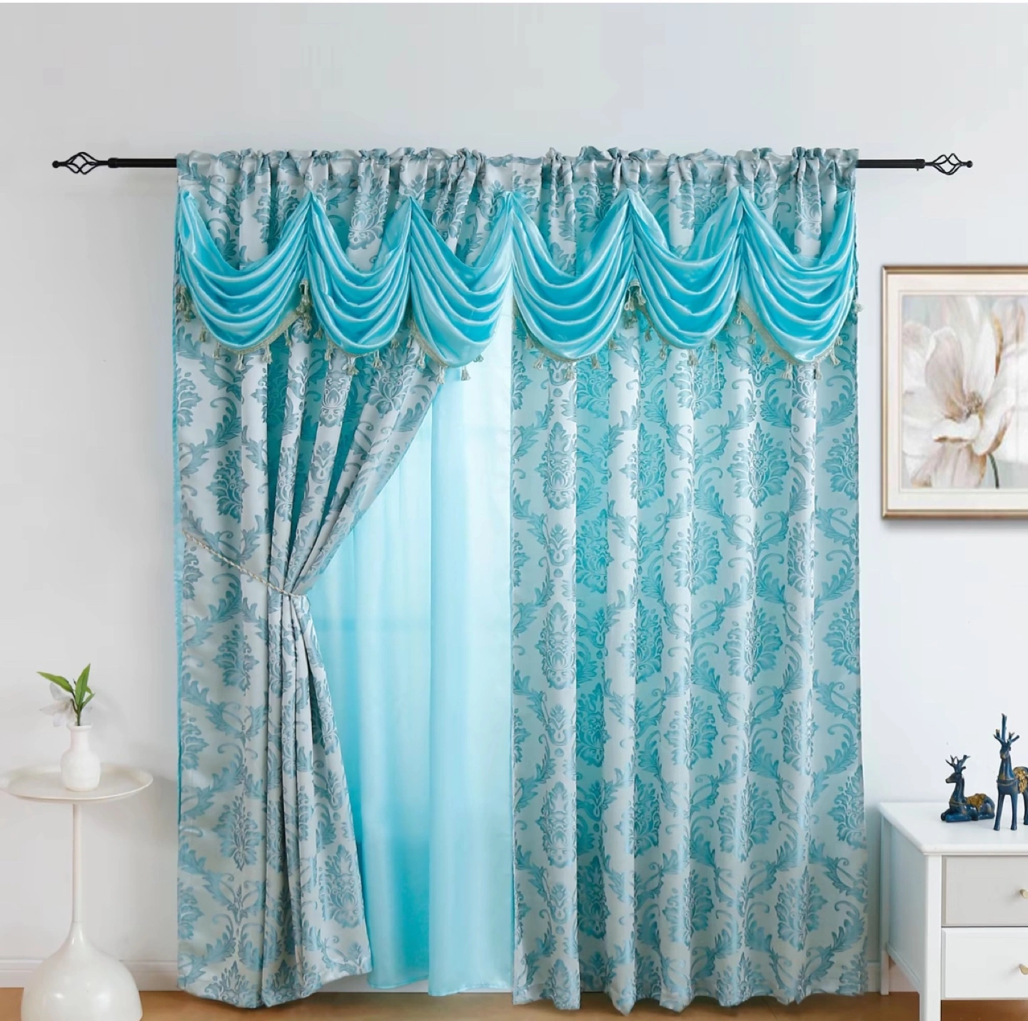 Elegant aqua window curtain set. Features a beautiful damask pattern and matching valance. Includes two panels and a sheer curtain. Adds a touch of sophistication to any room.