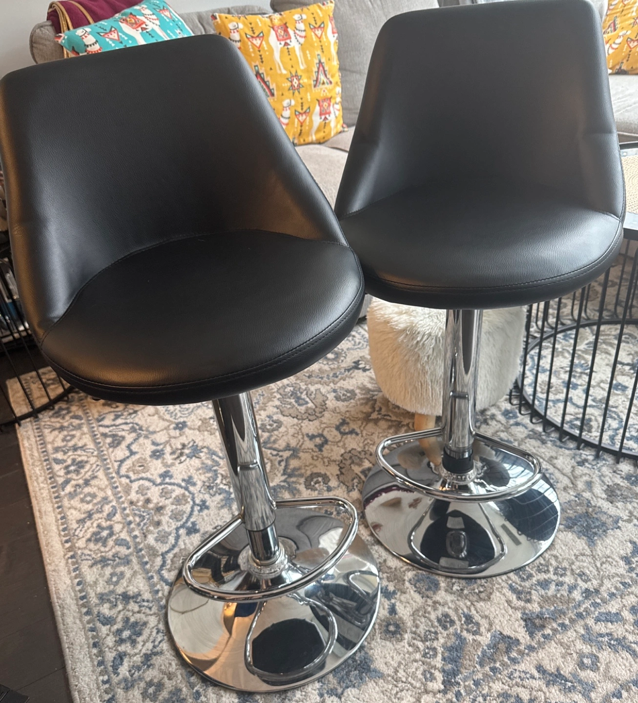 Two black bar stools, chrome base,Faux leather seats. Perfect condition. Modern design.