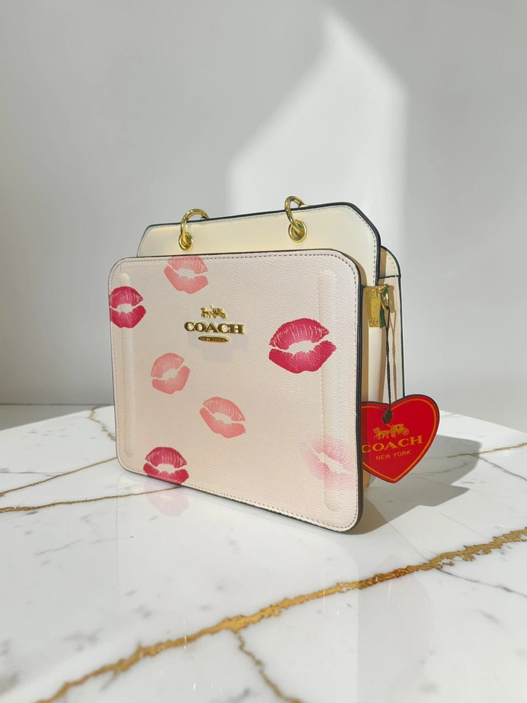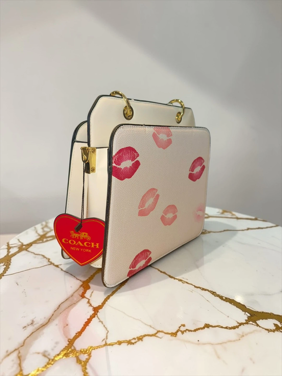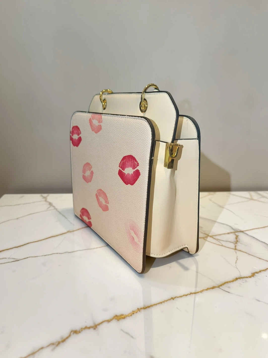 This Coach handbag features a cream base with a playful pink kiss print. It has gold hardware and a top handle for carrying. Includes the original Coach New York hang tag.