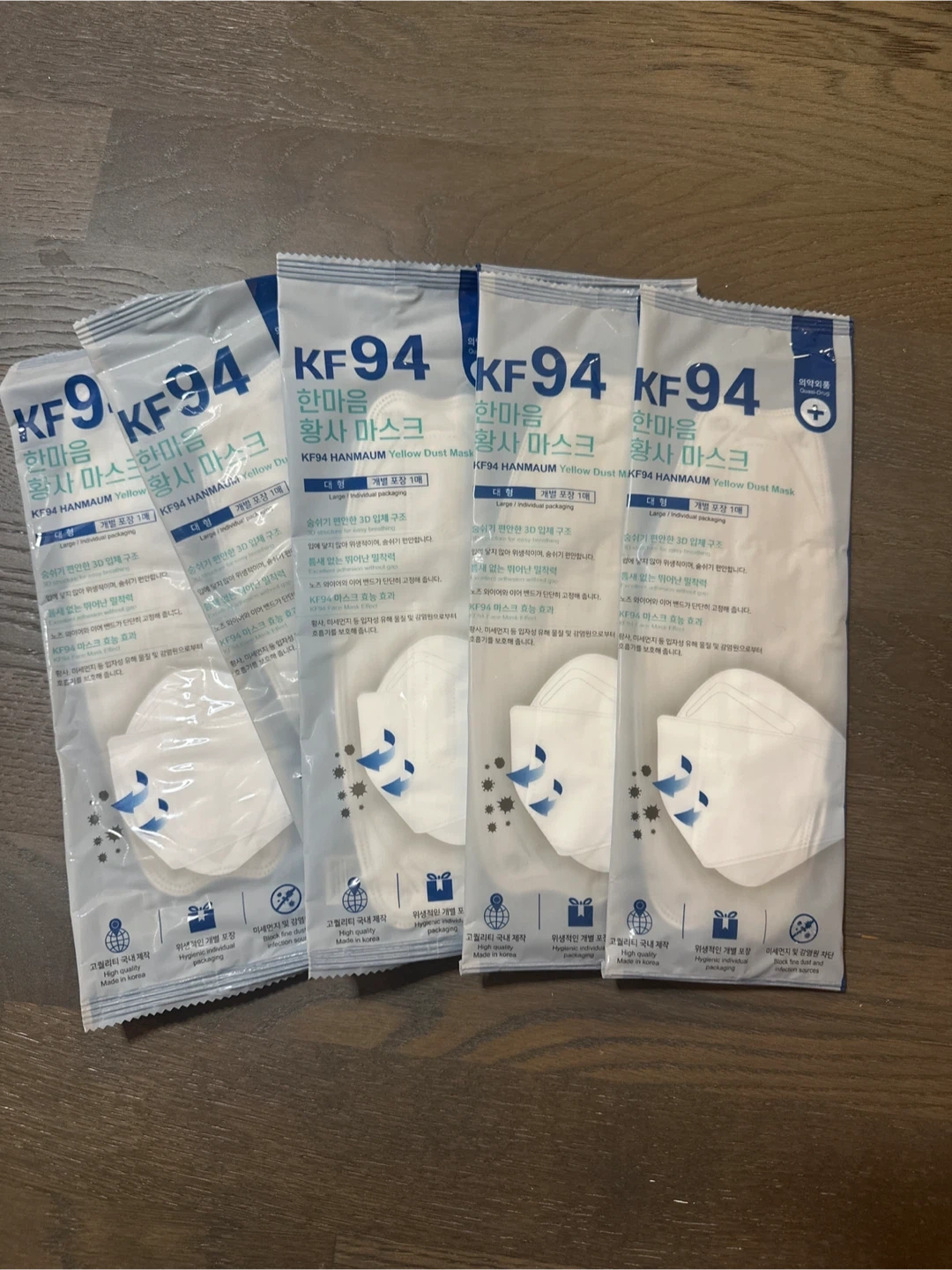 Selling 5 individually packaged KF94 Hanmaum Yellow Dust Masks in size Large! They feature a 3D design for comfortable wear and high-quality filtration. Perfect for protection against yellow dust and other airborne particles
