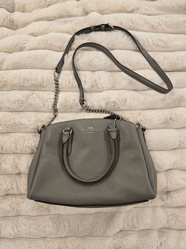 Grey leather satchel. Features a chain and leather strap. Top handles and a crossbody strap. Subtle Coach branding.