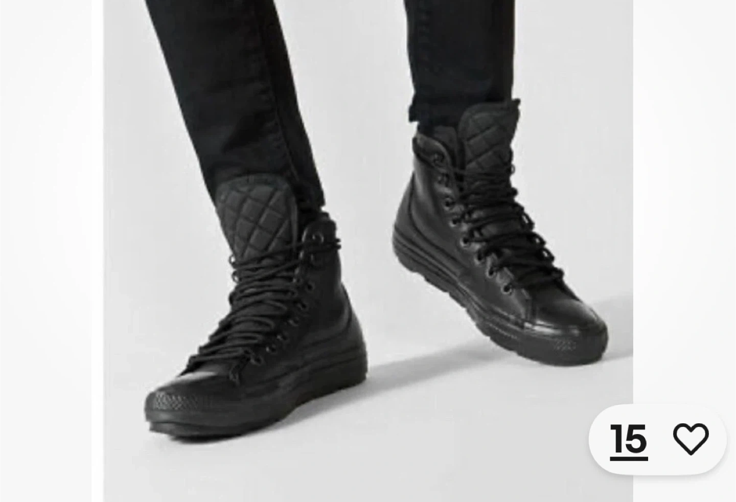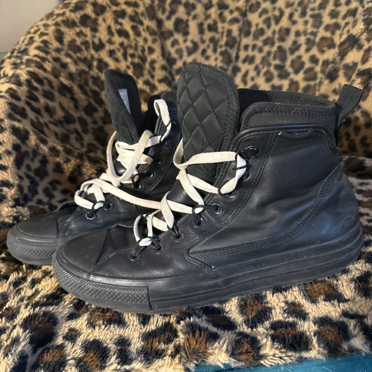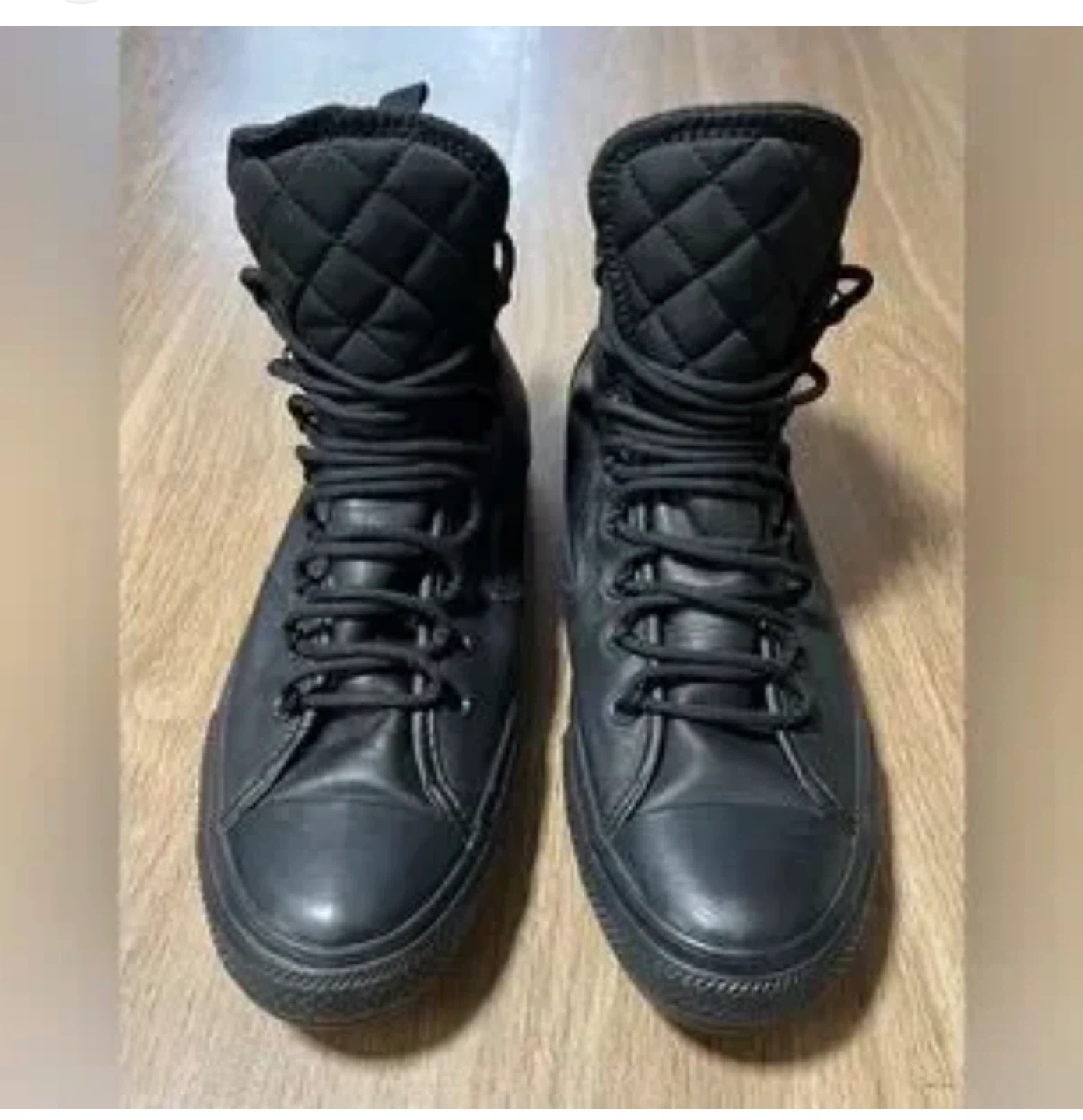 These black Converse All Star Chuck Taylor high-top boots are made of leather. They feature a quilted collar and durable laces for a secure fit. The rubber outsole provides traction. These boots are ready for cooler weather!