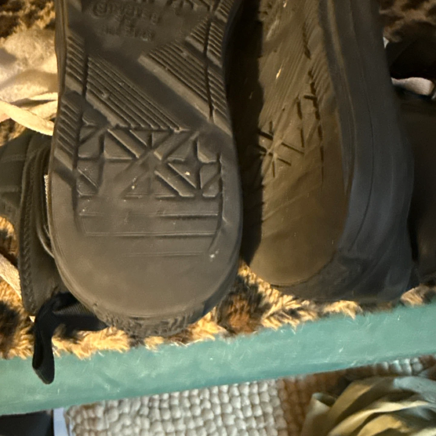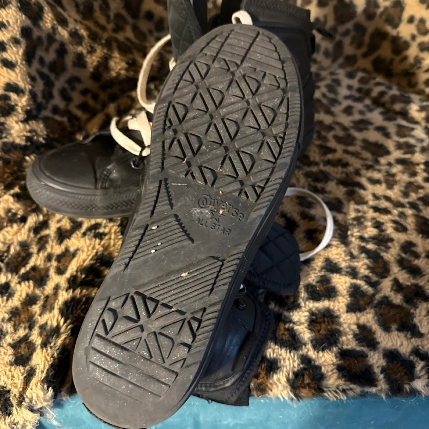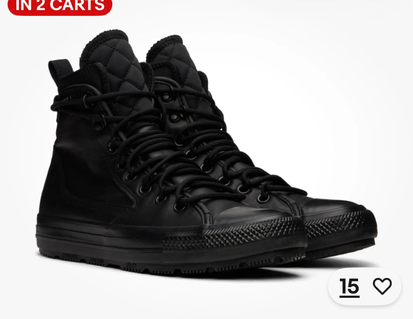 These black Converse All Star Chuck Taylor high-top boots are made of leather. They feature a quilted collar and durable laces for a secure fit. The rubber outsole provides traction. These boots are ready for cooler weather!