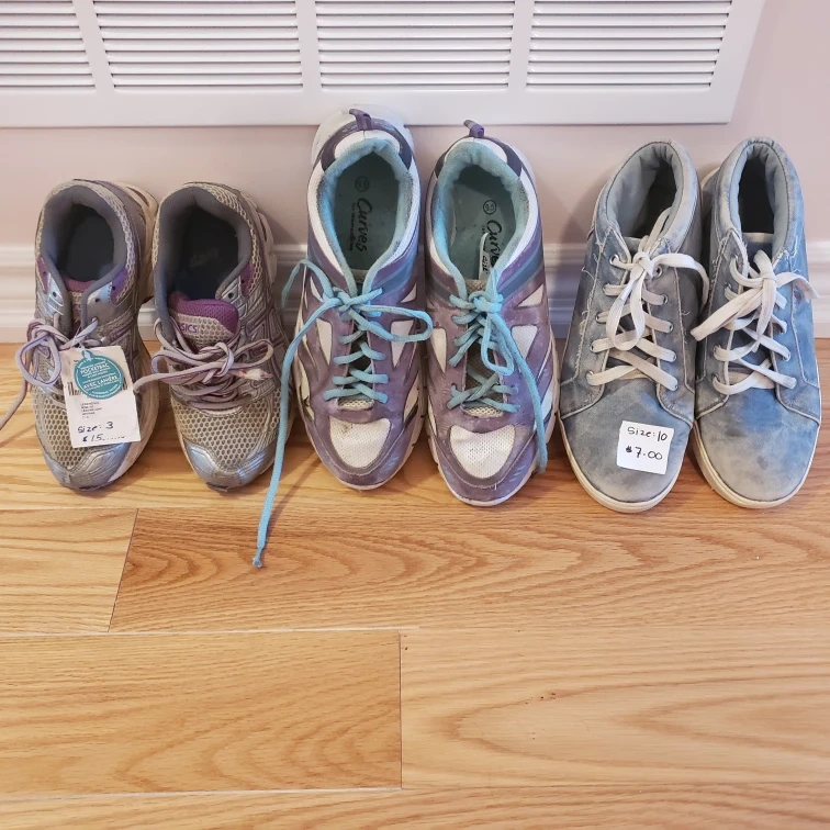 Four pairs of shoes: 2 pairs of running shoes, 1 pair of low-top sneakers, and 1 pair of high-top sneakers. Women's/Girls Running Shoes: Brandnew & Gently-worned Running Shoes, Check it out to save $: Blue Running Shoes size: 7 ----$8.00 Purple/blue Running Shoes size: 9.5--- $12.... Children Purple Running Shoes size: 3----$15.... $35/all.... Warden Birchmount on McNicoll at 100 Fundybay blvd near David Lewis school
