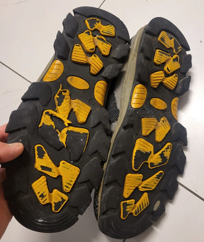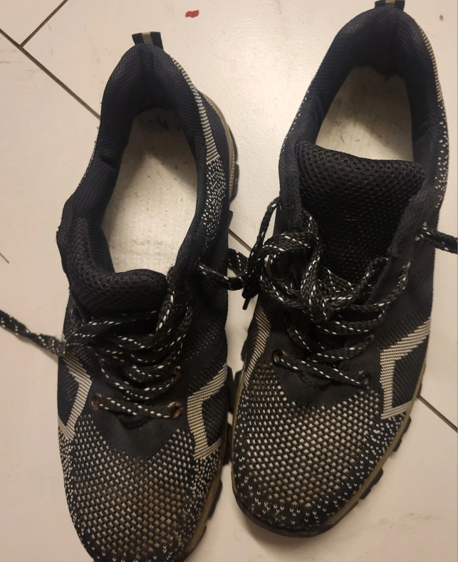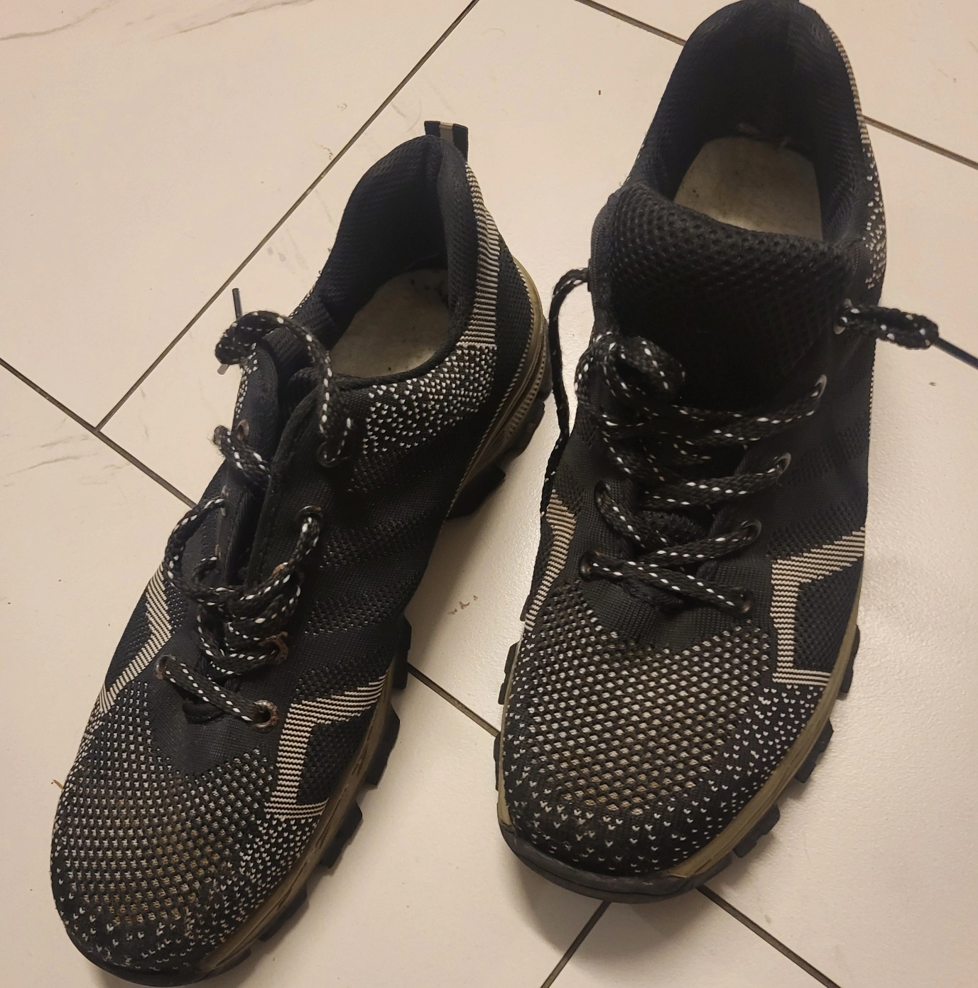 Pair of used men's safety shoes. Black and grey breathable fabric upper. Lace-up closure. Durable rubber outsole with yellow accents.