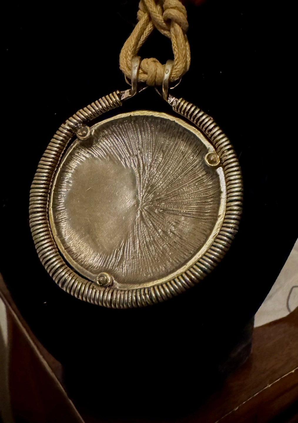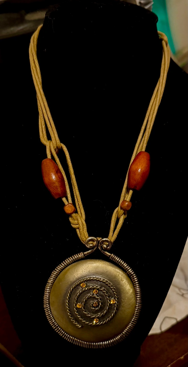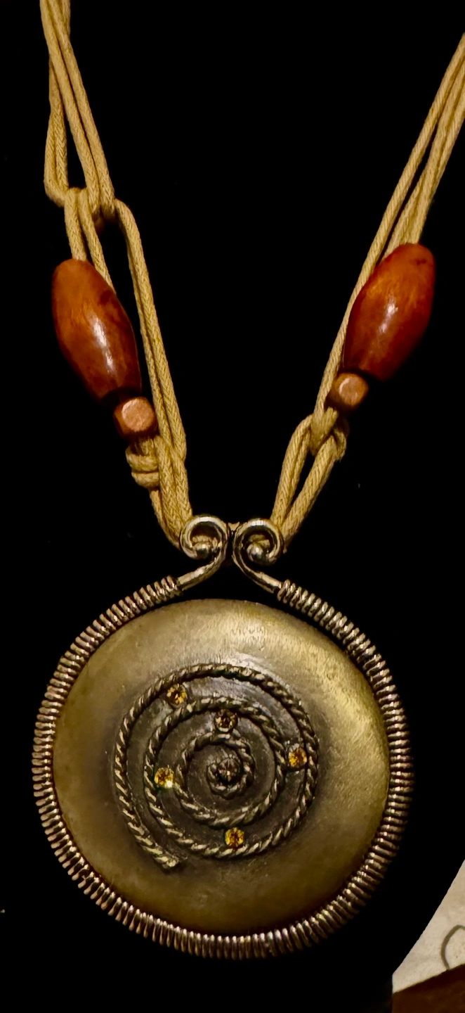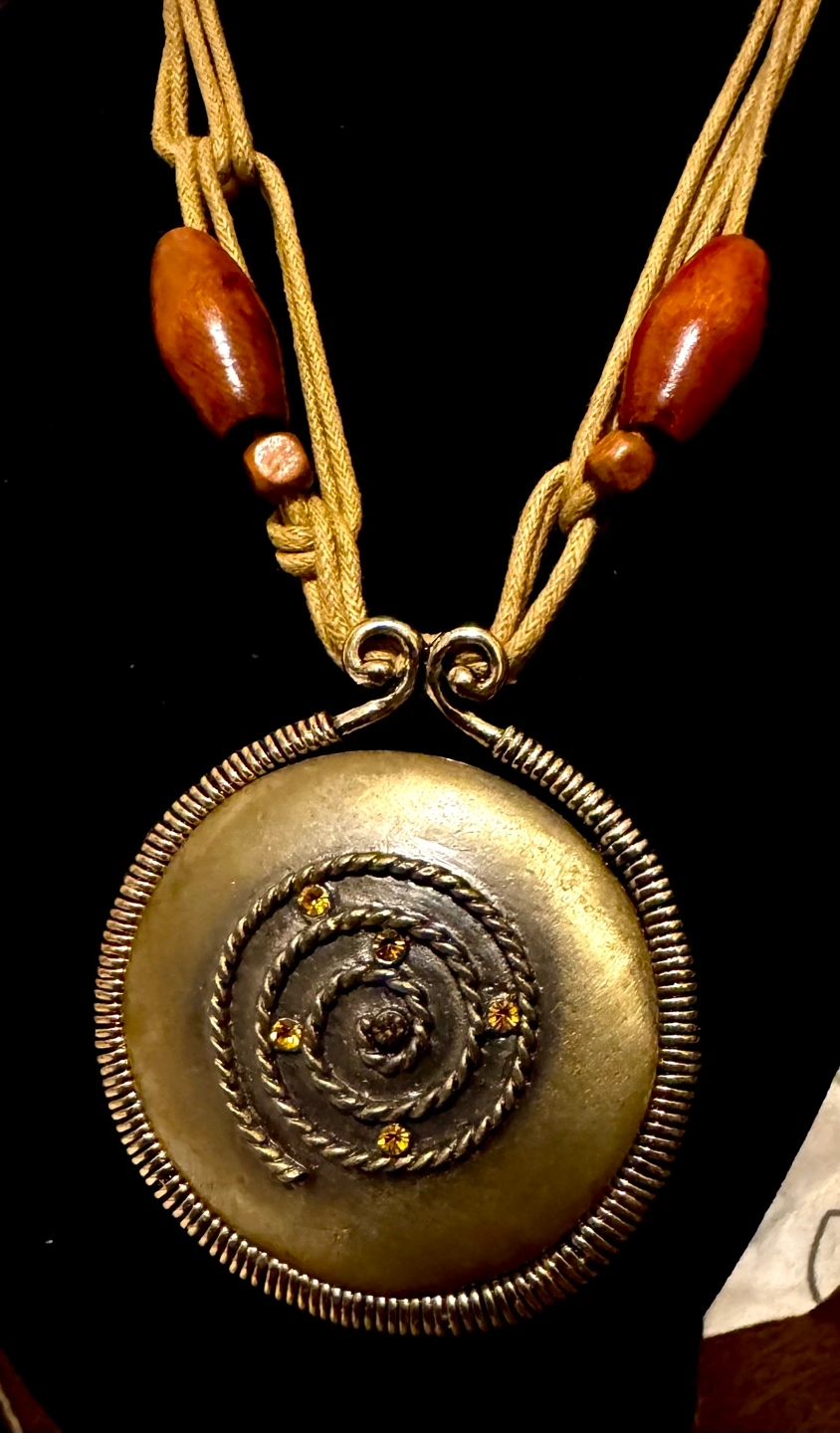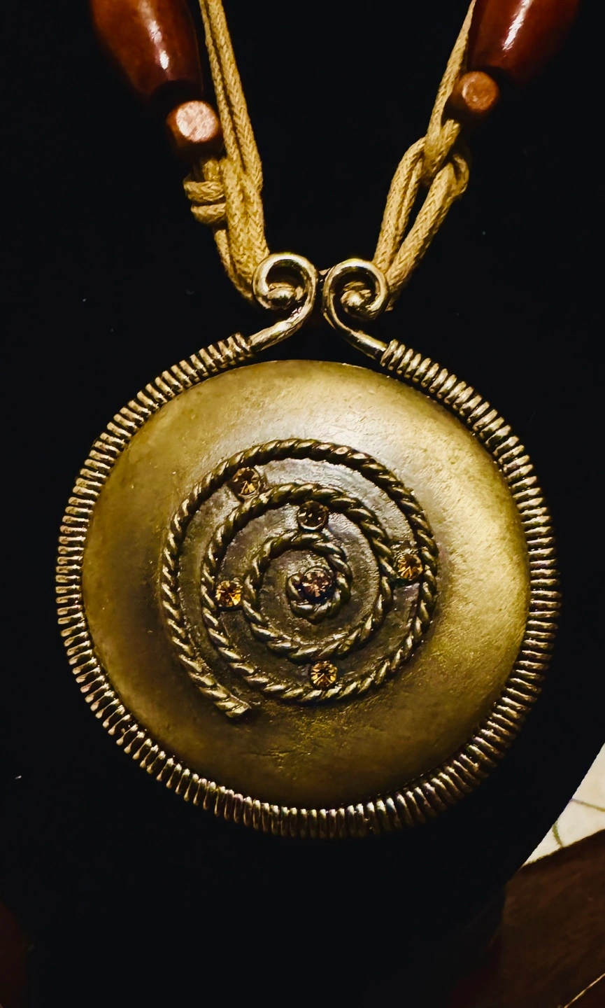 circular pendant necklace. Features a bronze-toned metal disc with etched spiral design and small amber-colored stones. Beige cord necklace with dark brown wooden beads.