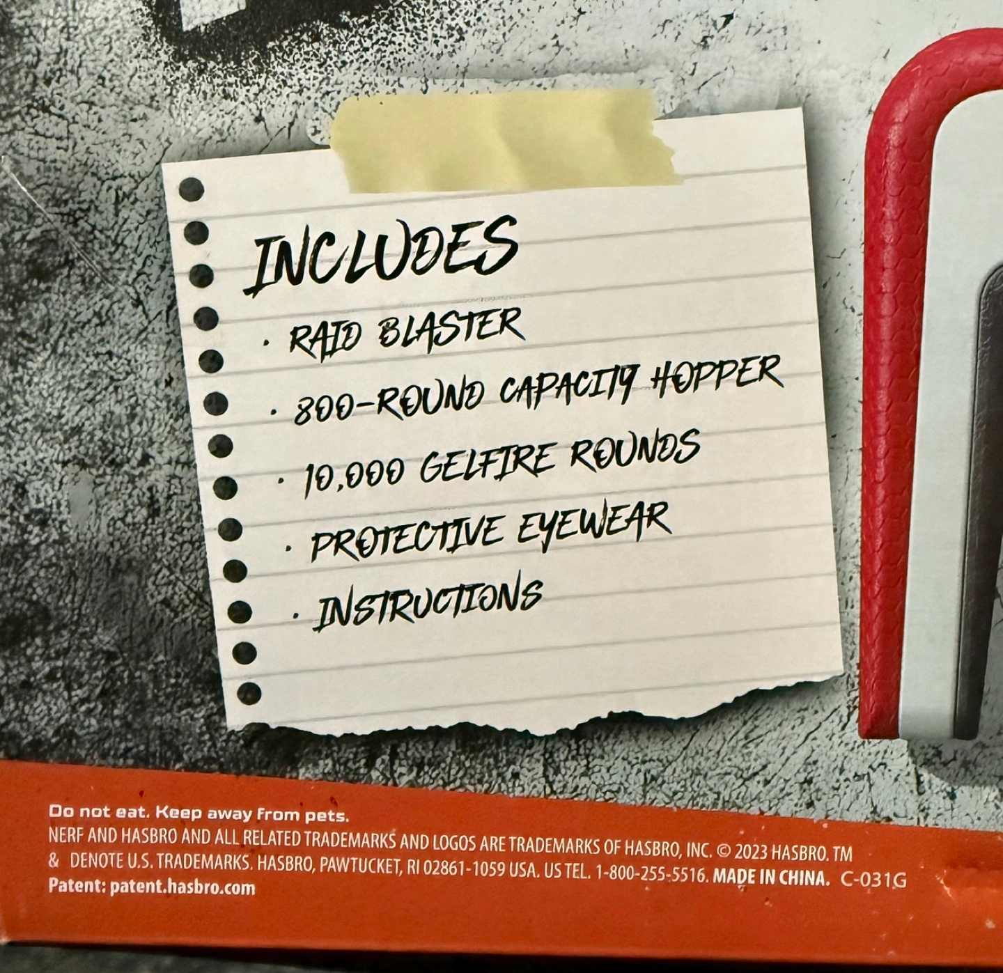 Includes 800-round capacity hopper, 10,000 Gel Fire rounds, protective eyewear, and instructions.