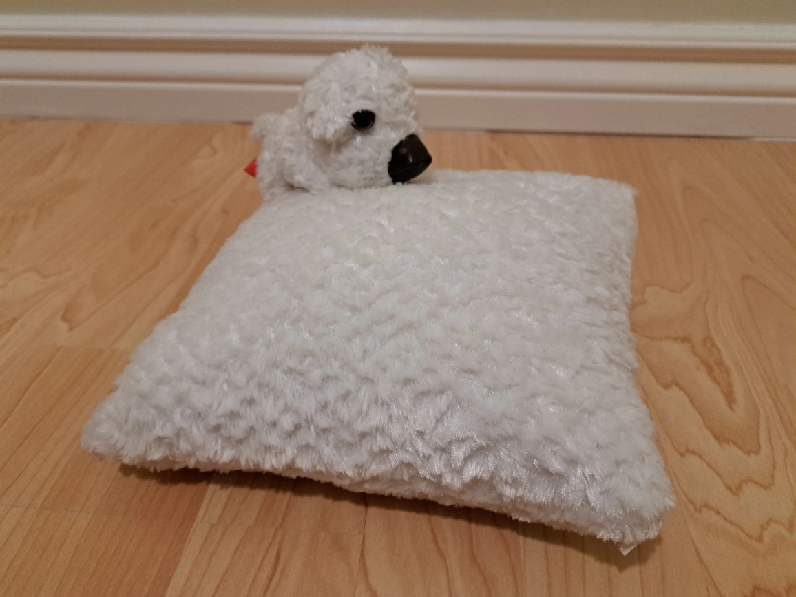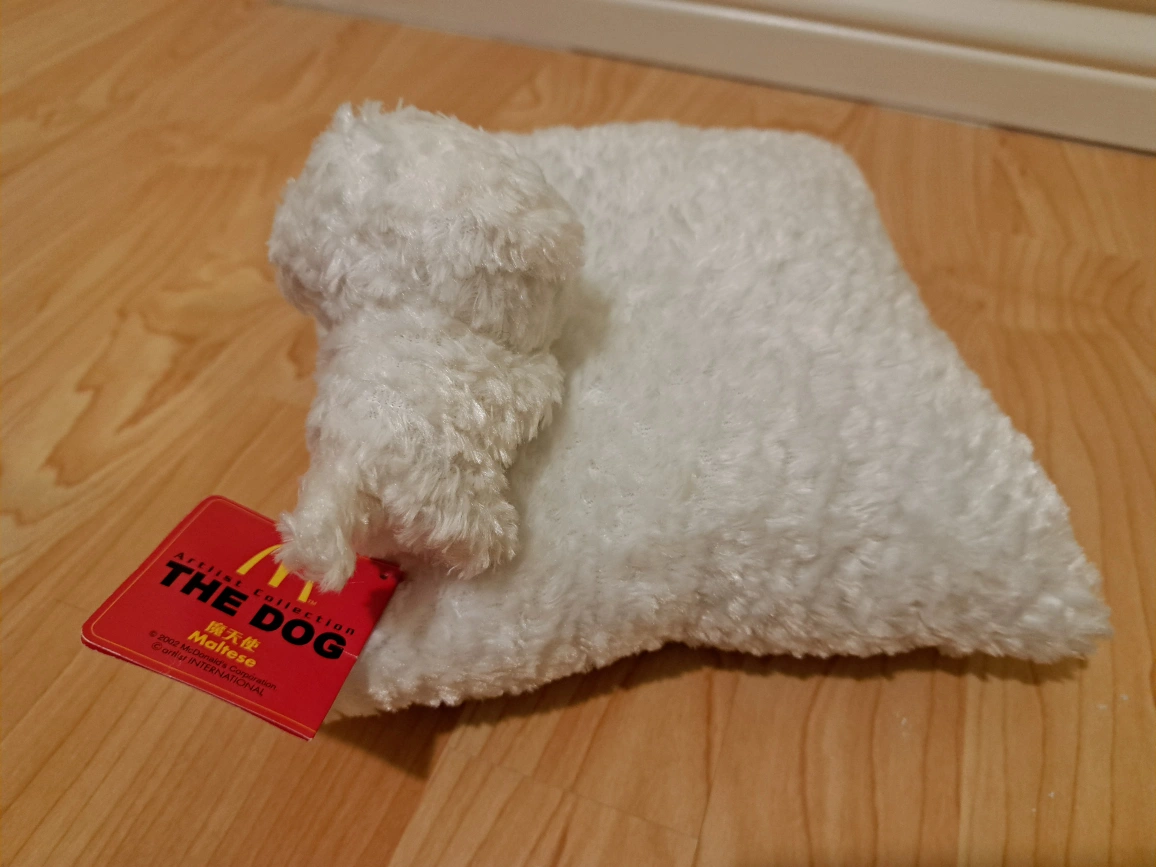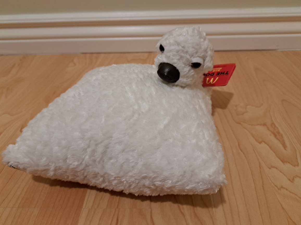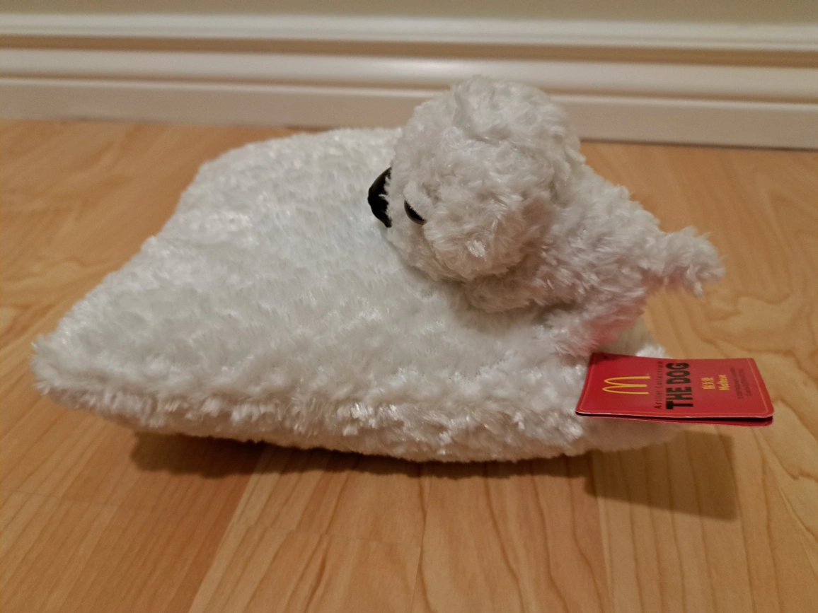 Adorable white plush dog pillow. Part of McDonald's The Dog collection. Soft, fluffy texture. Perfect for collecting or cuddling.