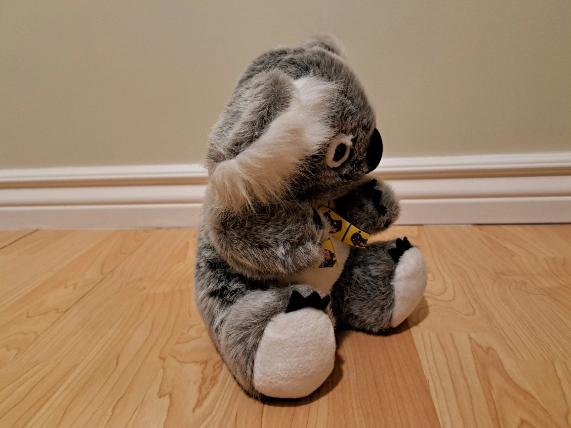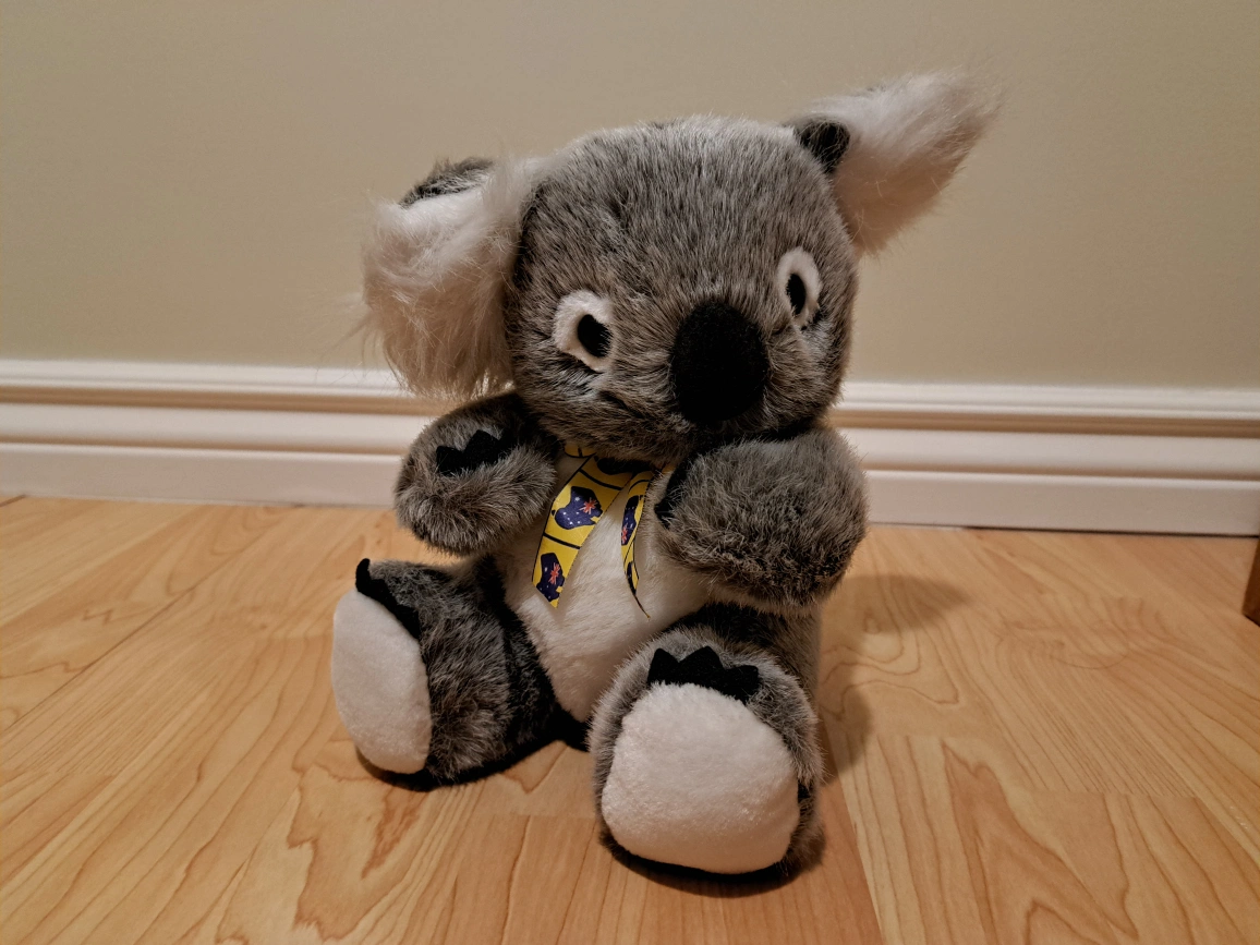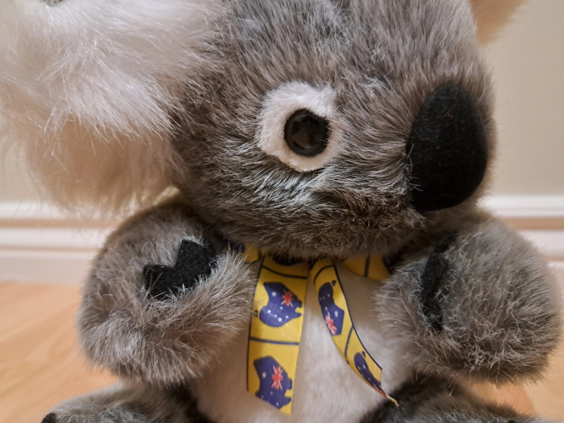 Grey plush koala, white inner ears and paws. Features a yellow ribbon with Australian flag design. Collectible stuffed animal.