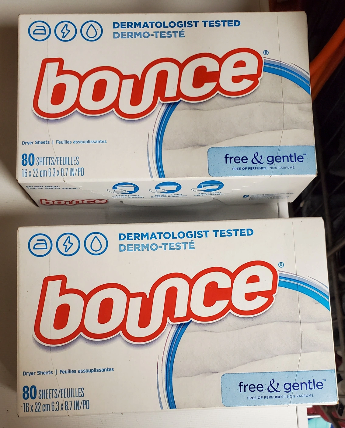 Two boxes of Bounce Free & Gentle Dryer Sheets