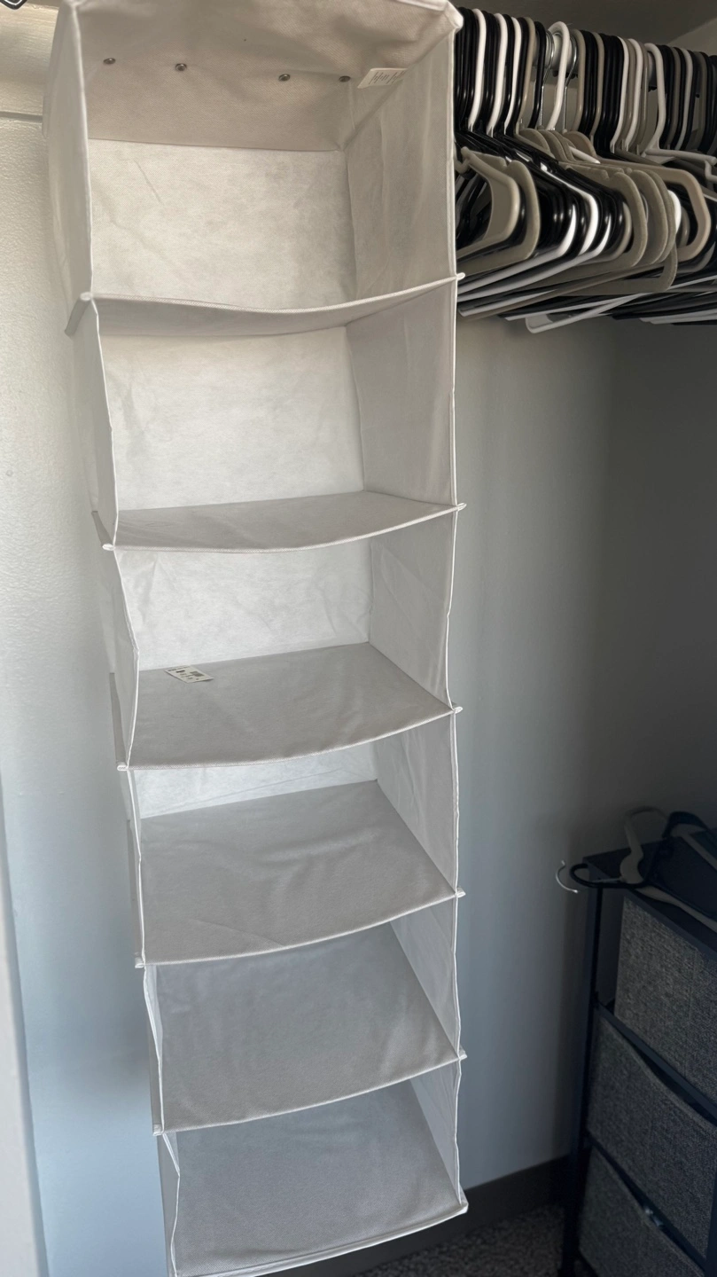 Five-shelf hanging closet organizer. Fabric construction. Great for clothes, accessories, or small items.