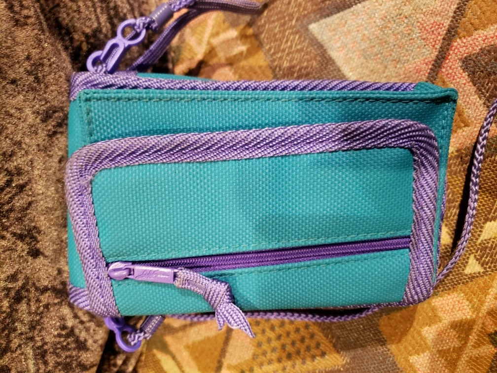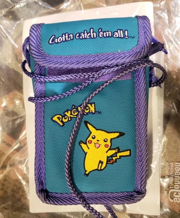 Teal and purple Pokémon carrying case. Features Pikachu and the phrase "Gotta catch 'em all!" Includes a drawstring closure and shoulder strap. Suitable for a Game Boy, Game Boy Advance