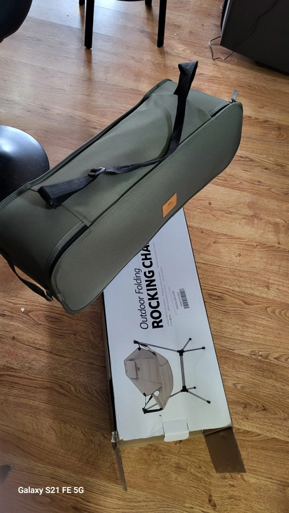 Portable camping rocking chair. Folds for easy storage and transport. Olive green fabric. Includes carry bag.