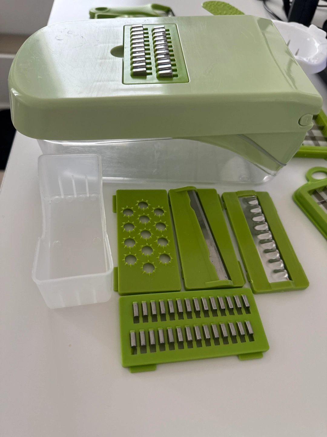 Complete set. Includes various blades and attachments. Great for chopping, slicing, dicing vegetables. Easy to use and clean. Green plastic construction.