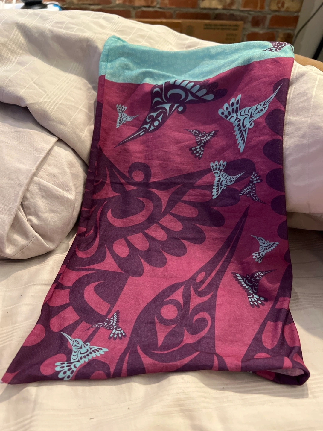 Beautiful neck gaiter featuring a vibrant hummingbird and floral design. Soft, stretchy fabric. Perfect for various outdoor activities or fashion accessory.