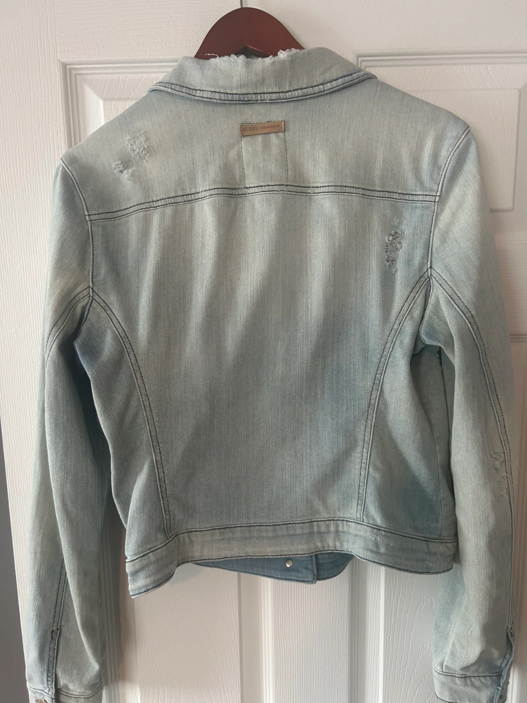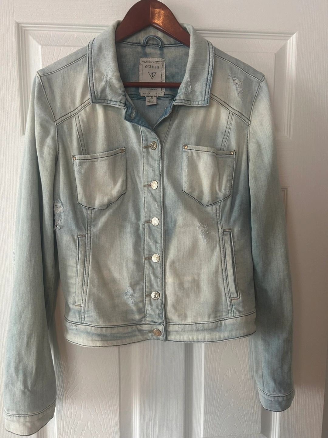 Vintage Light wash denim jacket. Features distressed detailing. Size large.( fits like a medium) in pristine condition. Barely worn, no rips or stains or signs of wear. Very soft denim