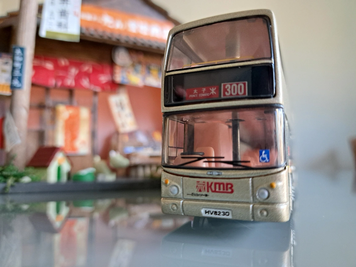 Detailed diecast model of a Kowloon Motor Bus double-decker. Gold coloured body. Route number 300 clearly visible. Collectible item. Excellent condition.