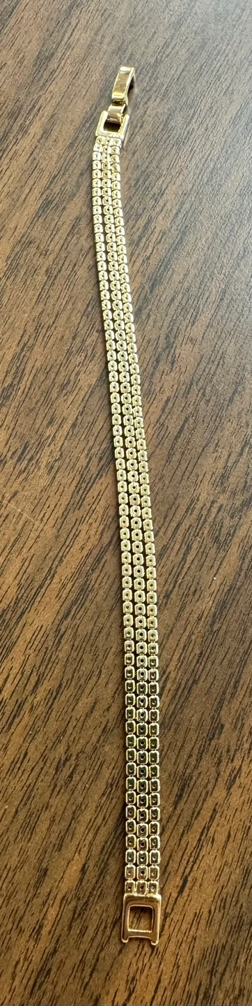 Three-strand bracelet. Features blue and clear stones. Gold tone metal. Clasp closure. Elegant design. Perfect for any occasion.