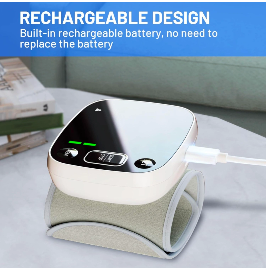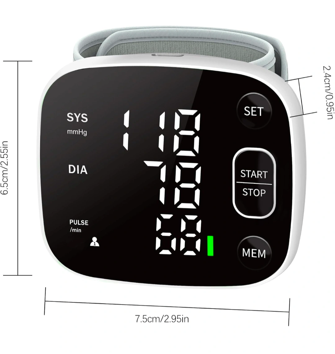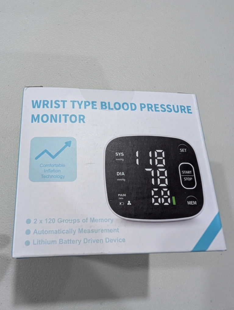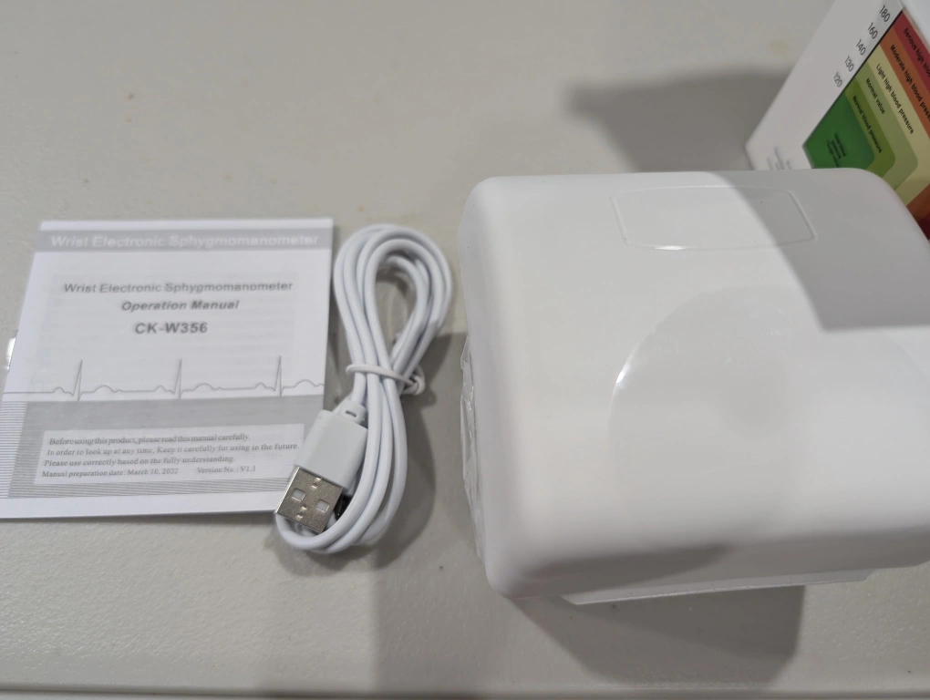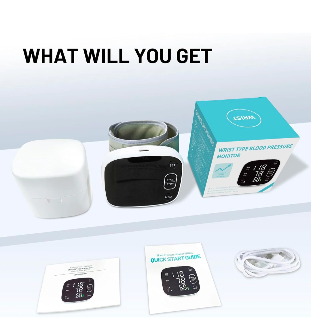 Automatic wrist blood pressure monitor. Large digital display. Includes USB charging cable and user manual. Memory function. Compact and easy to use.
