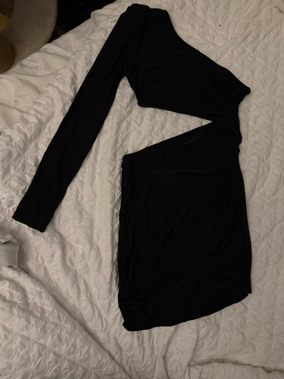 Form-fitting mini dress. One-shoulder design. Cut-out detail at the side. Long sleeve. Stretchy material.