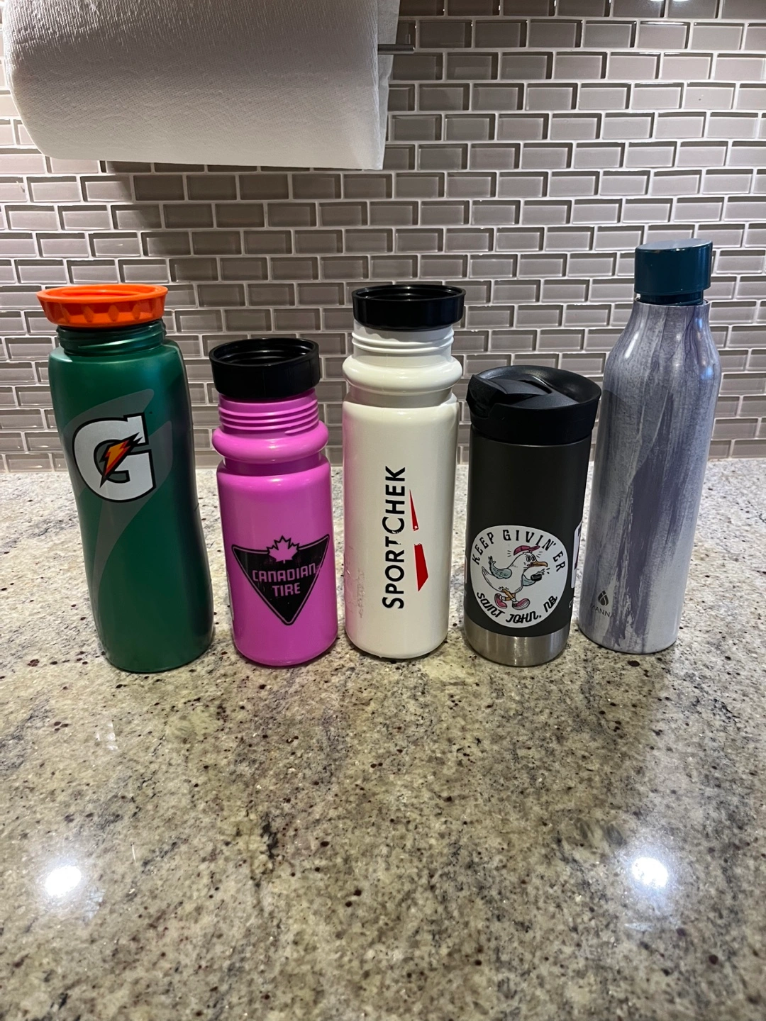 Five Assorted Water Bottles and Travel Mug