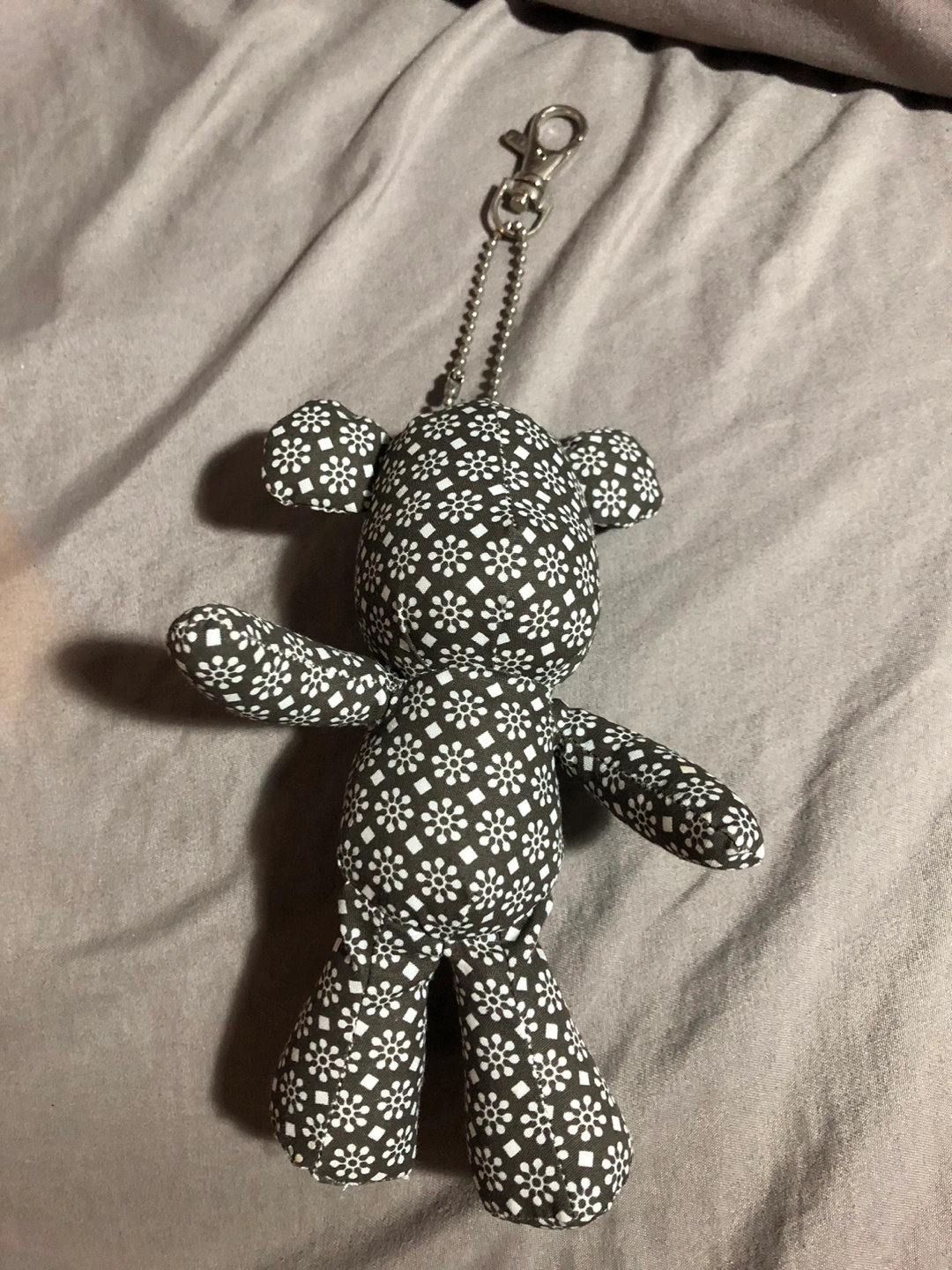 Small, dark-grey teddy bear keychain. Features a repeating white floral pattern. Attached to a silver chain and clasp.