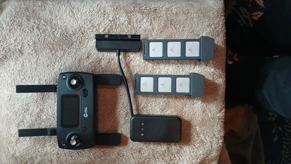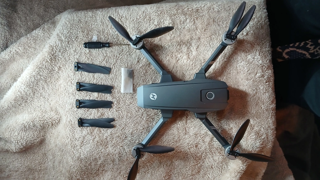 Foldable drone. Includes carrying case, two batteries, charger, remote, and extra propellers. Great for aerial photography. Used condition.