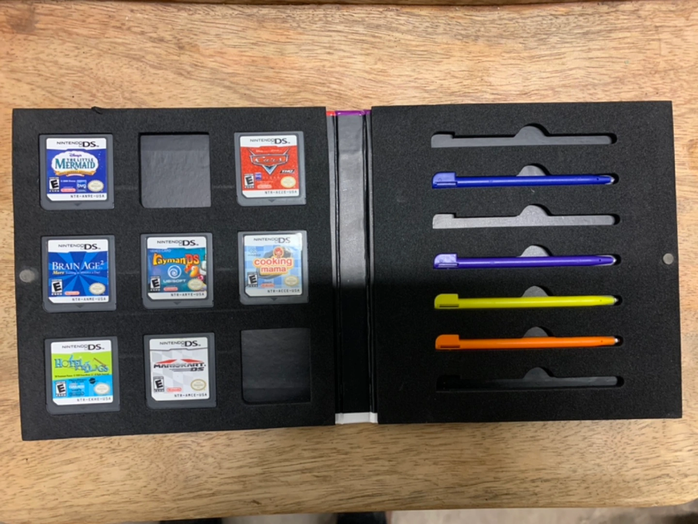 Holds seven Nintendo DS games and includes four stylus pens. Games include: The Little Mermaid, Cars, Brain Age, Rayman, Cooking Mama, Hotel Dusk, and Mario Kart. Pre-owned, some wear and tear on the case.