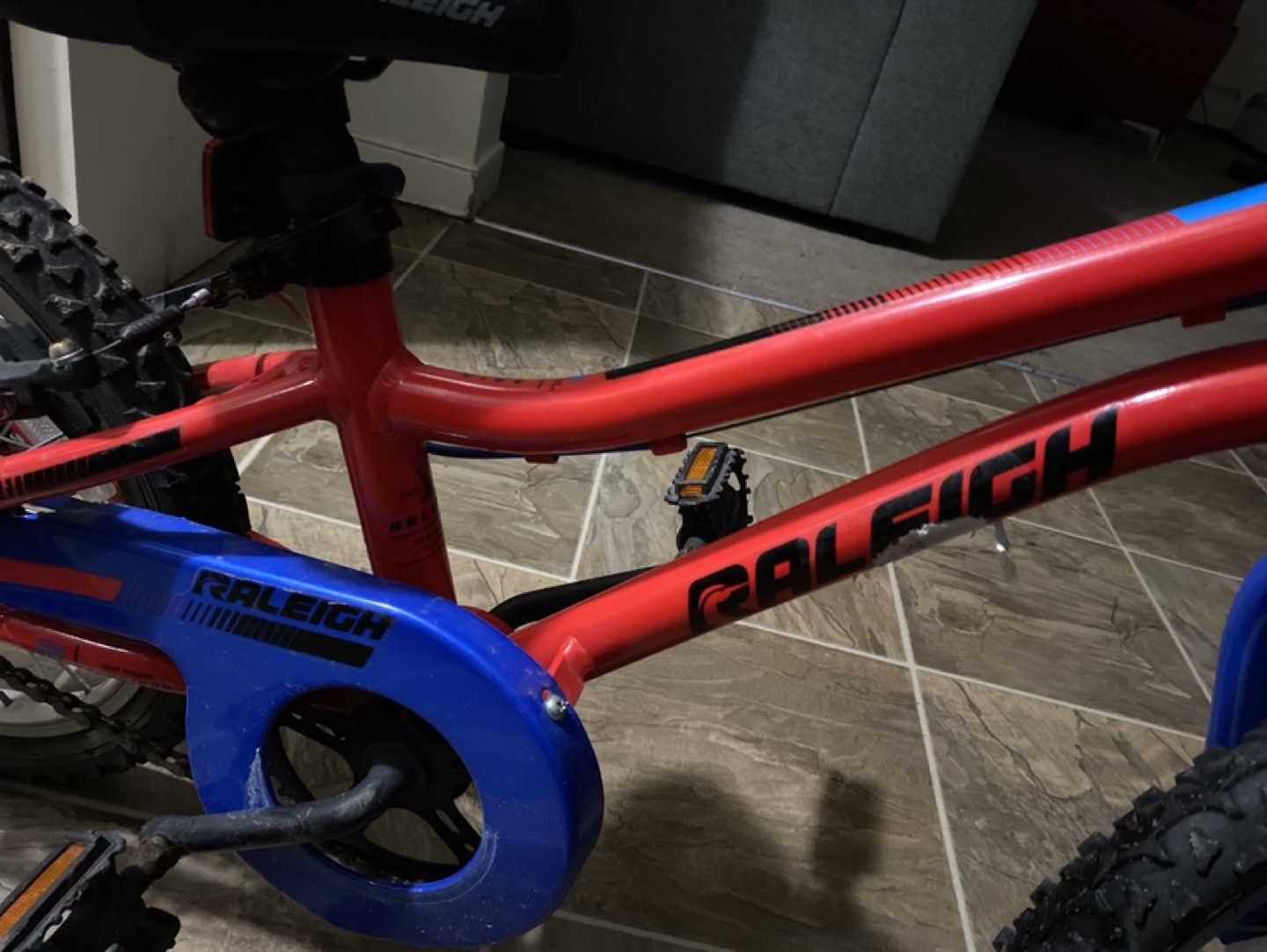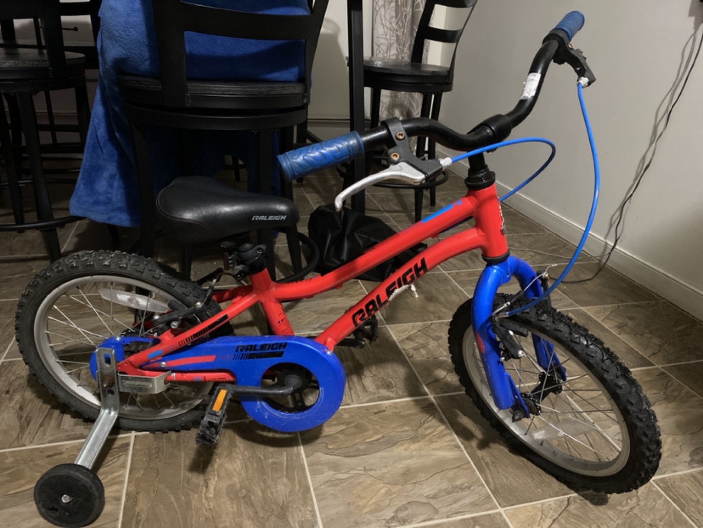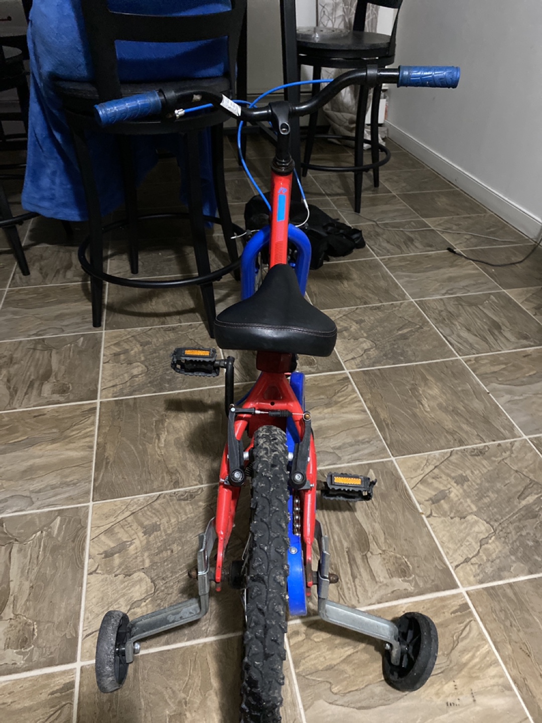Red and blue children's bicycle. Includes training wheels. Good condition. Suitable for younger children.