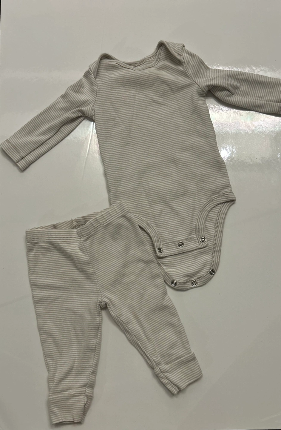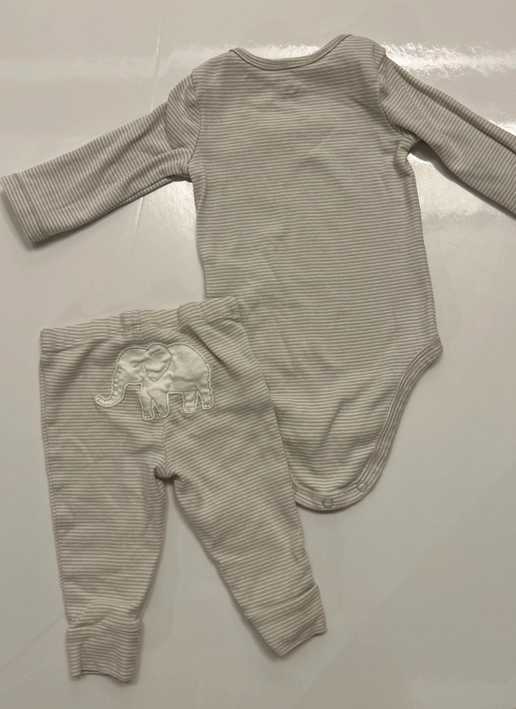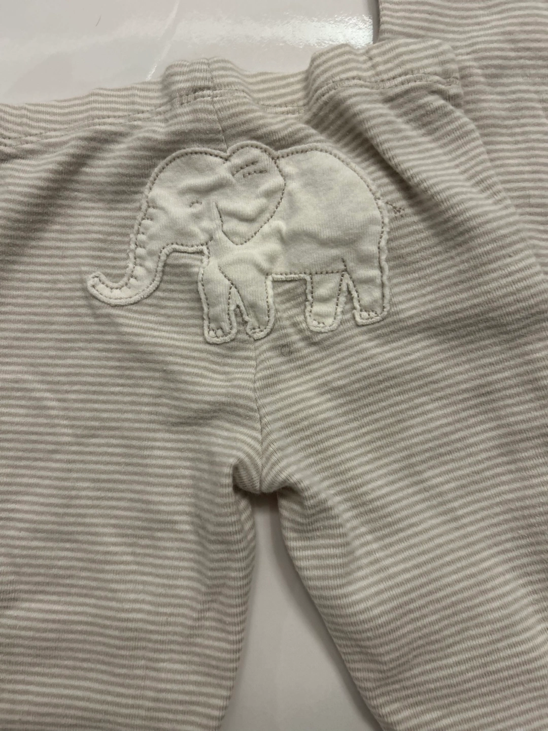 Adorable Carter’s baby outfit. Features a long-sleeve striped bodysuit and matching leggings. Leggings have cute elephant applique on the back. Soft and stretchy material.