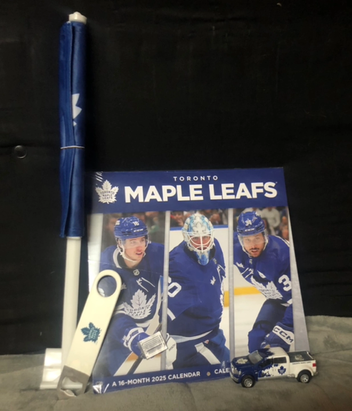 Toronto Maple Leafs fan bundle!Perfect for fans or Collectors!Includes a car flag, a 16-month 2025 calendar, a bottle opener and a Maisto 2009 Mighty Ford F-350 diecast car.